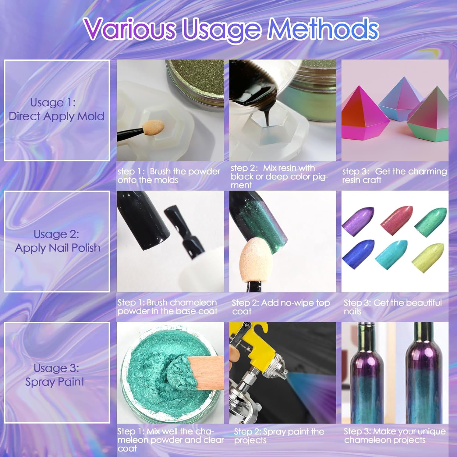 - 🫧Mica pigment's 3 Different Effects: Different color bases create a different effect surface. Applying pearl powder on a white background will produce aurora effect, and on a black background will be chrome effect. Mixing a small amount of nail chrome powder into the black resin will produce like starry sky effect. So easy to use to get the variety of colors you’re looking for!