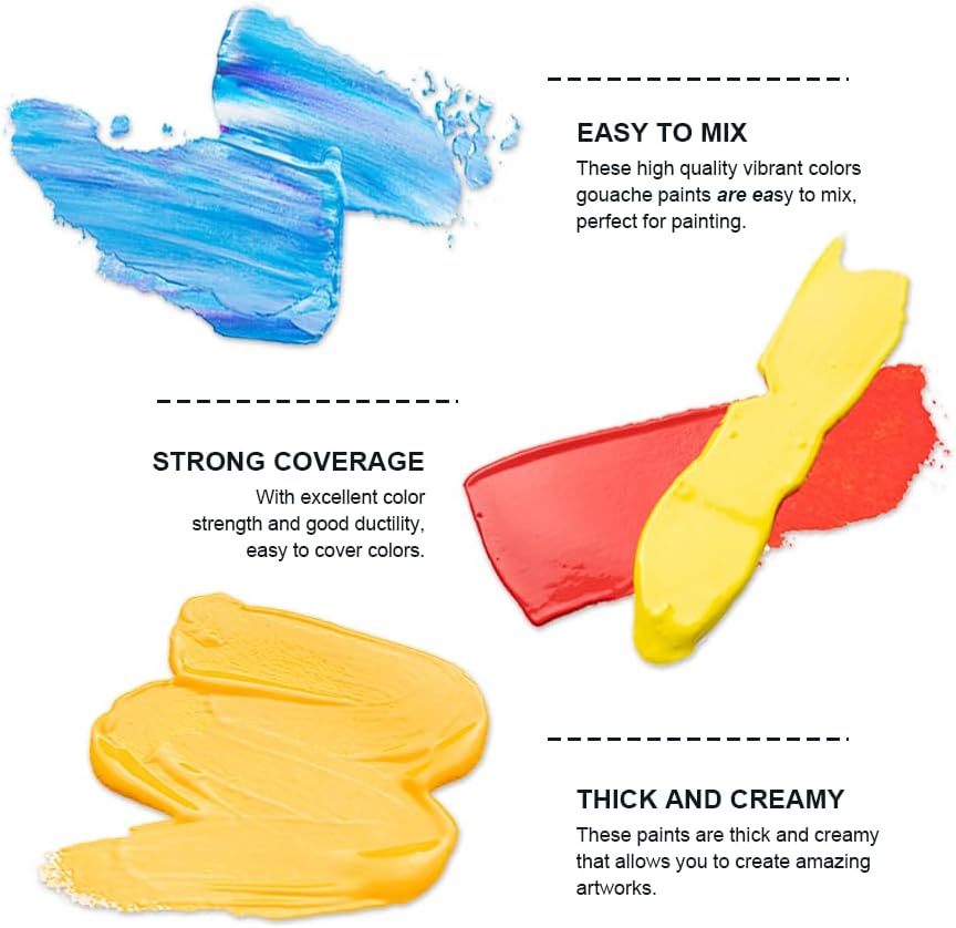 - 🎨36 VIBRANT COLORS OF GOUAHCE TUBES: Upgraded design with excellent sealing lid will keep our gouache paint wet and creamy for getting better painting experience.