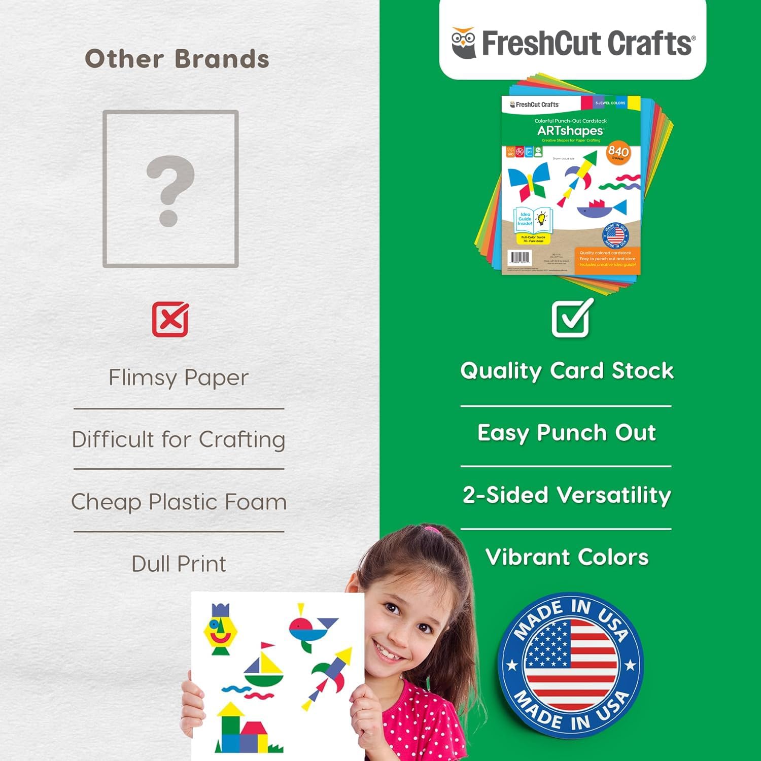 - FEEL-GOOD CRAFTING: At FreshCut Crafts, we're all about crafting with a conscience. Our products are not only about creativity but also about making a positive impact. Proudly family-made in the USA, we use high-quality, acid-free American-made paper that's perfect for preserving memories and creating lasting keepsakes. Our energy-efficient production processes are designed to minimize waste, ensuring that we leave a smaller footprint on the planet.