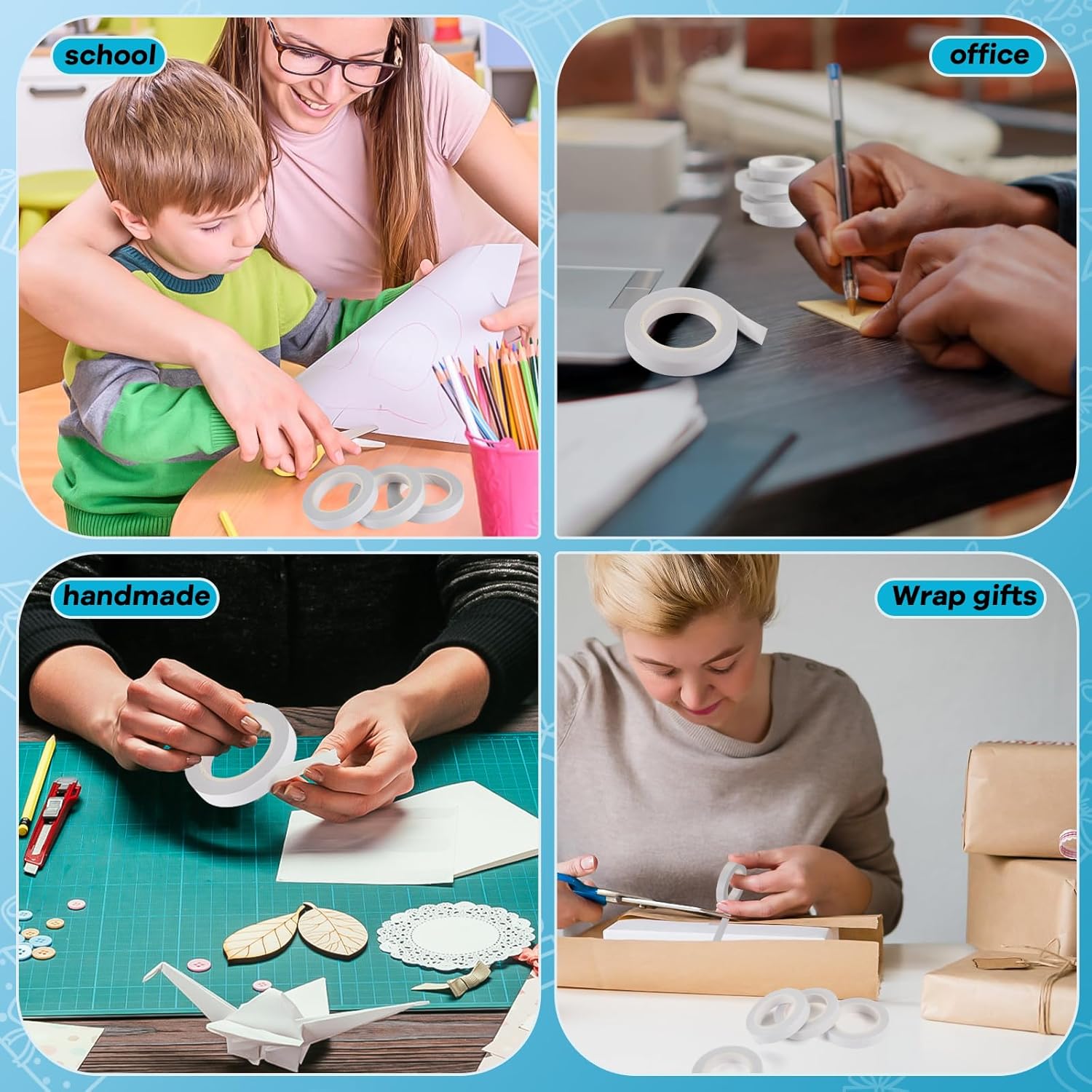- 【Widely used】This double sided tape (as a scrapbook tape, craft tape) can be widely used in paper, glass, wood, plastic, etc. Double sided tape can be used for item repair, card making, gift packaging, scrapbooks, documents, photos, picture frames, handicrafts, etc. It is an essential double-sided tape for DIY.