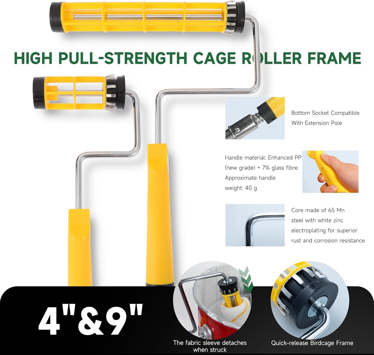 - Large and Small Paint Roller Matching: 9-inch large paint roller is suitable for fast painting of large wall areas and efficient coverage; small paint roller can accurately deal with corners, window frames and other edges, and easily deal with details. Ideal for home renovation, partial repair, or industrial wall beautification