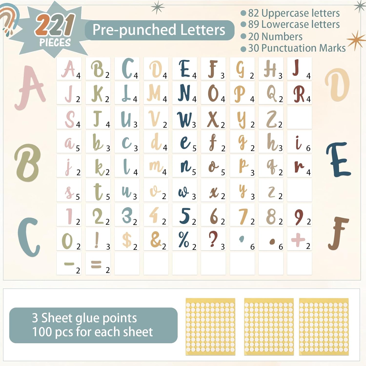 - Value Pack: this 221 pieces alphabet combo cutouts set includes 82 pieces of capital and 89 pieces of lowercase alphabet letters, 20 pieces of numbers, 30 pieces of punctuation marks and 100 pieces double-sided adhesive; Alphabet learning, sentence building, basic math training, punctuation using, satisfying all your basic skill training