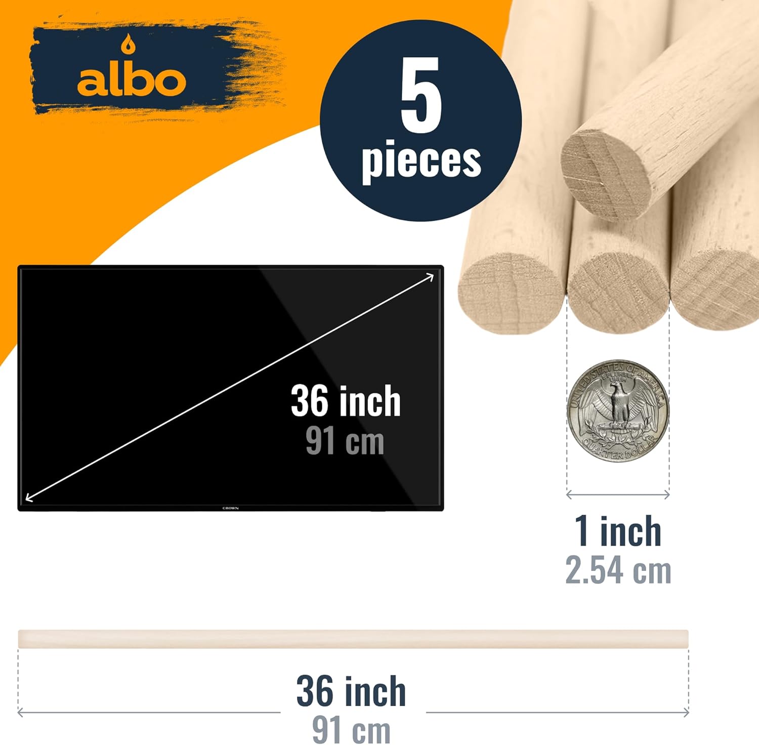ALBO 1" x 36" Wooden Dowel Rods Set - 5 Pack Birch Natural Strong Craft Sticks Stair Rails Shelf Supports Decor Hardwood Smooth Finish Woodworking Material DIY Furniture Bulk Value Pack