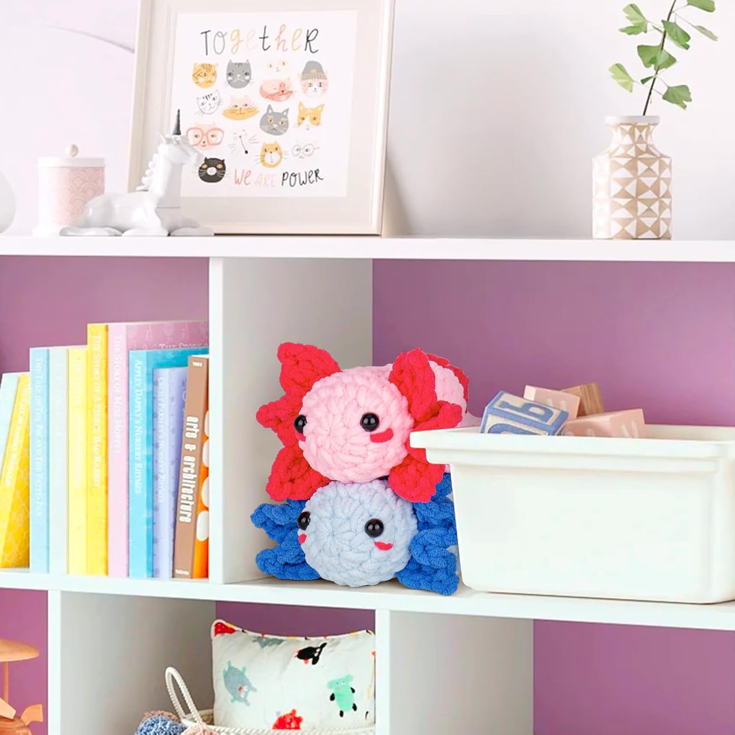 - All-In-One Crochet Kit : Our beginner crochet kit equipped with everything you need to start: 5 skeins of Beginner-Friendly Yarns, ample stuffing, a needle, 5 marker buckles, 4 safety eyes, 2 large crochet hooks, a pair of scissors, a crochet axolotl pattern, and a beginner's basic crochet manual.