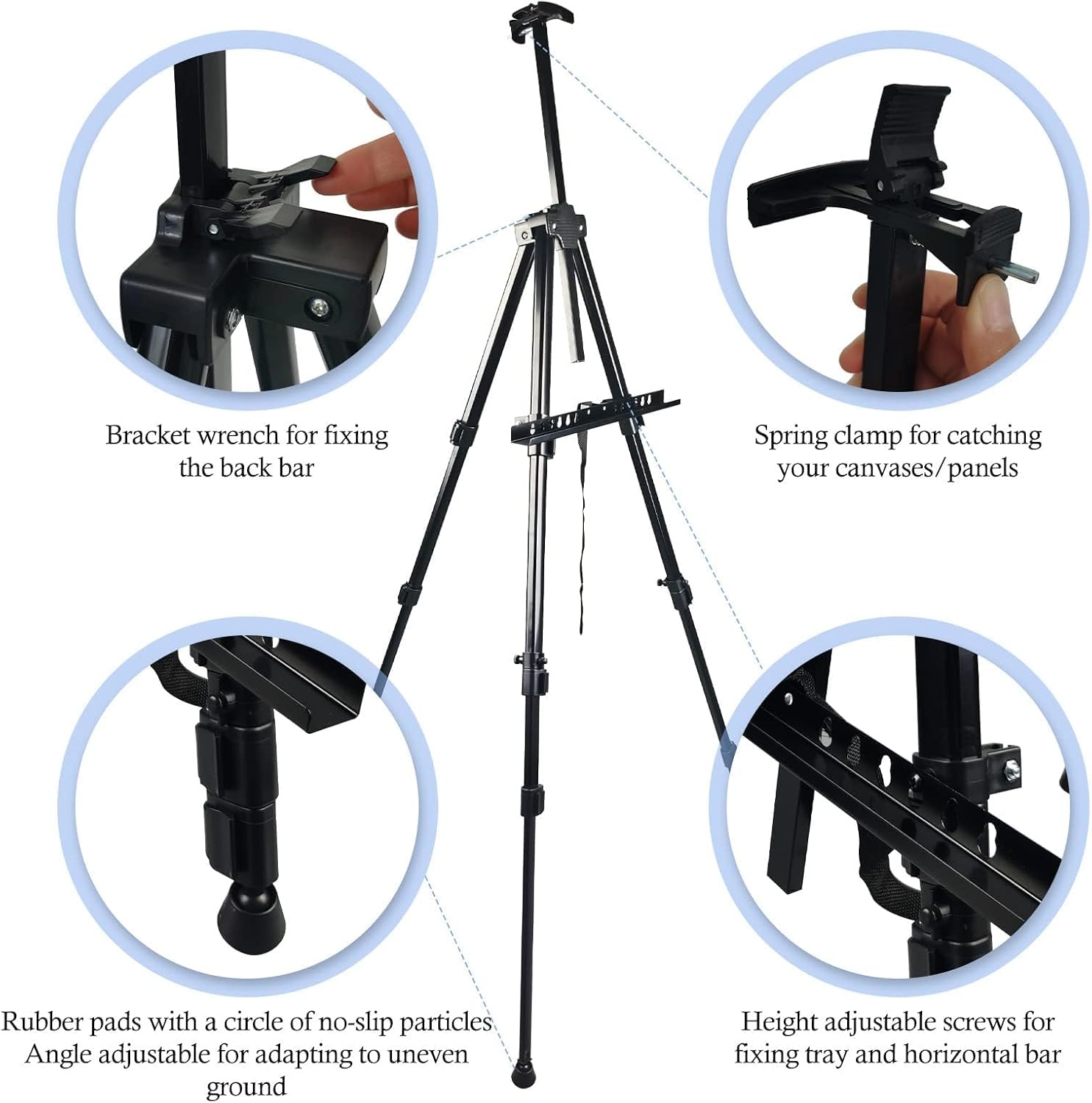 - [Art easel stand height adjustable] easels for painting canvas can be adjusted from 17 inches to 66 inches in height, perfect for floor or tabletop easel display, the art easel folds down to only 21 inches for easy storage and transportation, painting easel is easy to turn the knob for quick height and angle adjustment