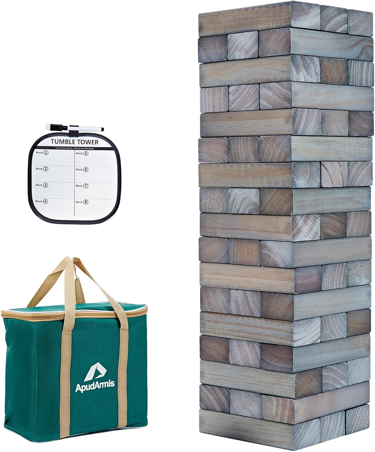 ApudArmis Giant Tumble Tower Stack to Over 5Ft, 60 PCS Pine Wooden Stacking Timber Game with 1 Dice Set - Classic Block Giant Outdoor Game (7.48 * 2.48 * 1.5 in Each Block, Gray)
