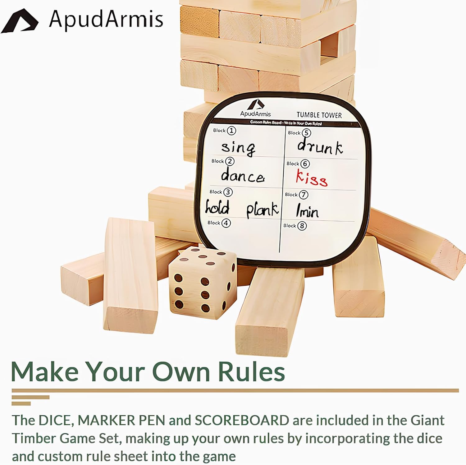 - Perfect Indoor And Outdoor Game: Our Giant Timber Game is easily for people to play, including Adults, Family. Parents can get timber for Back Yard fun. Itβs the best family activity spans the age gap. You can personalize the set and gather round your friends to play with it. And 1 Dice to add your game rules, make up your own rules by incorporating the Dice into the game.
