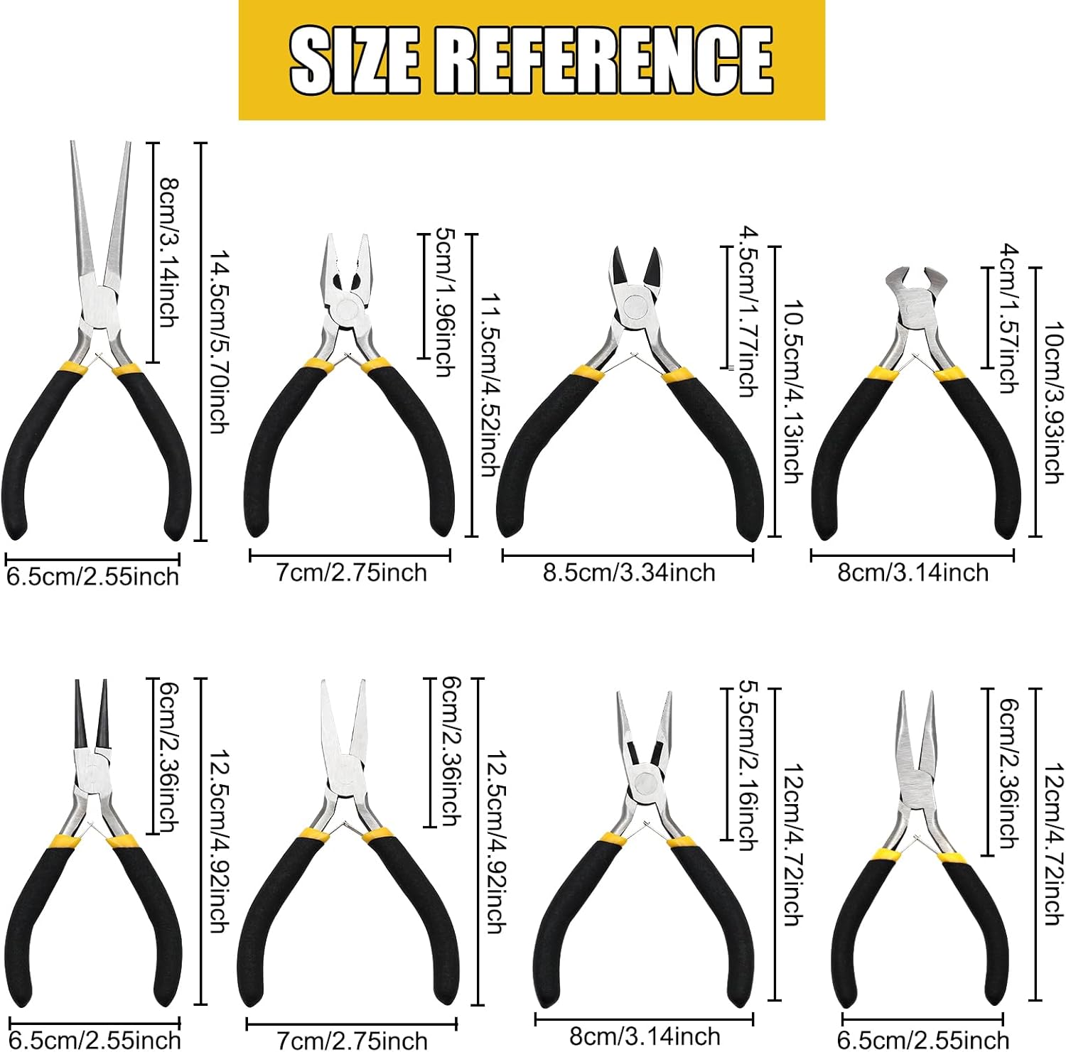 - Versatile Set with Muti Pliers - 8PCS professional pliers set with 8 different kinds to chose, tailored for both novices and experts. Versatile set includes: wire cutter, long nose pliers, round nose pliers, needle nose pliers , flat nose pliers, bent nose pliers, linesman pliersand end cutters.