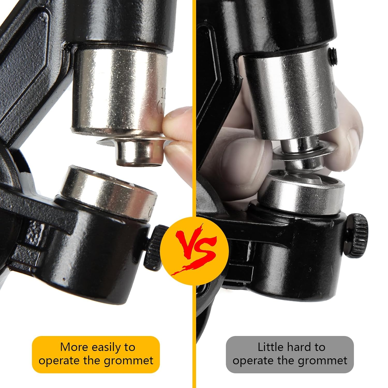 - Ease of use without Hole Punching: The grommet tool kit simplifies the process with magnetic dies that seamlessly align the grommets without the need for pre-punching holes. Save time by placing the grommet in the mold and pressing to complete the operation.