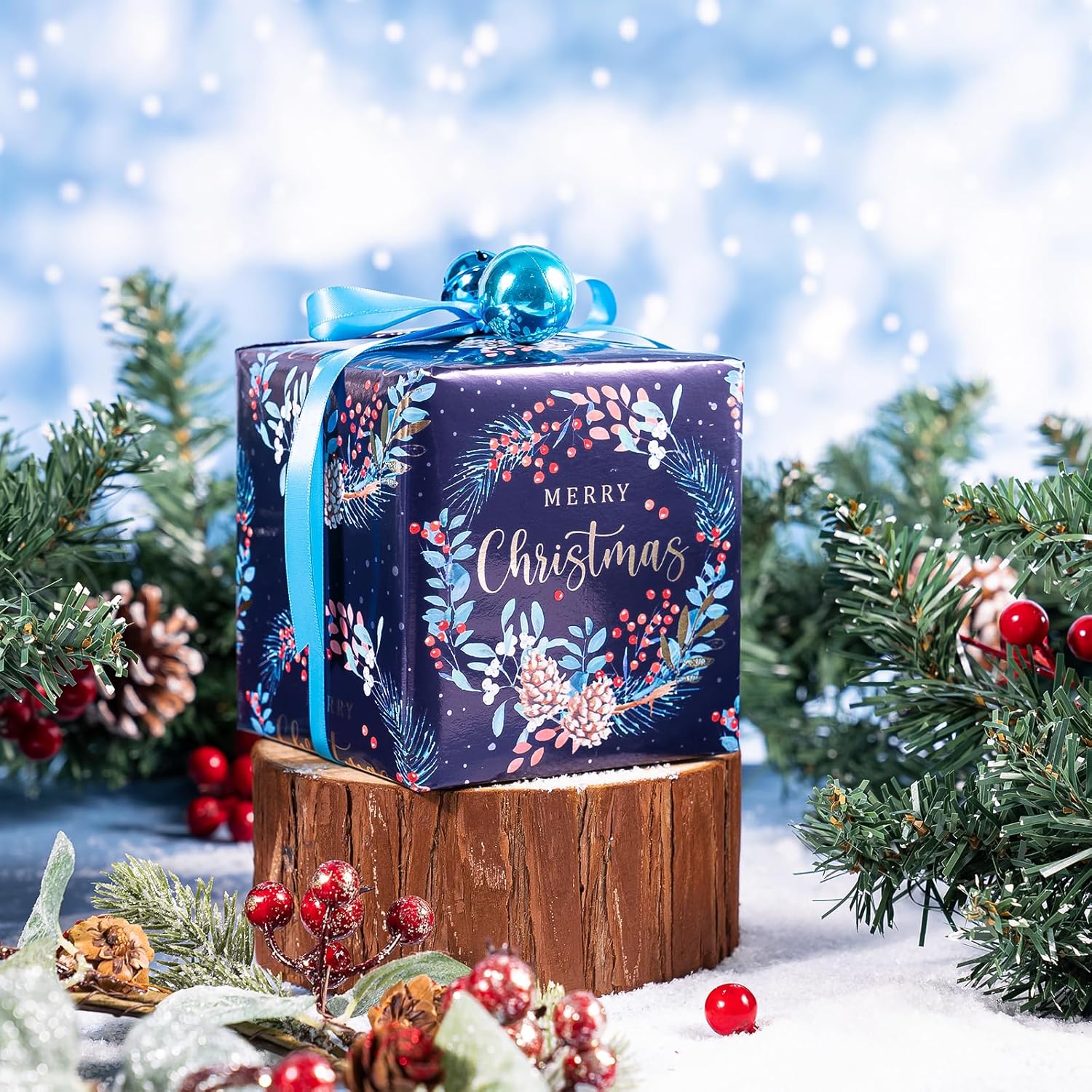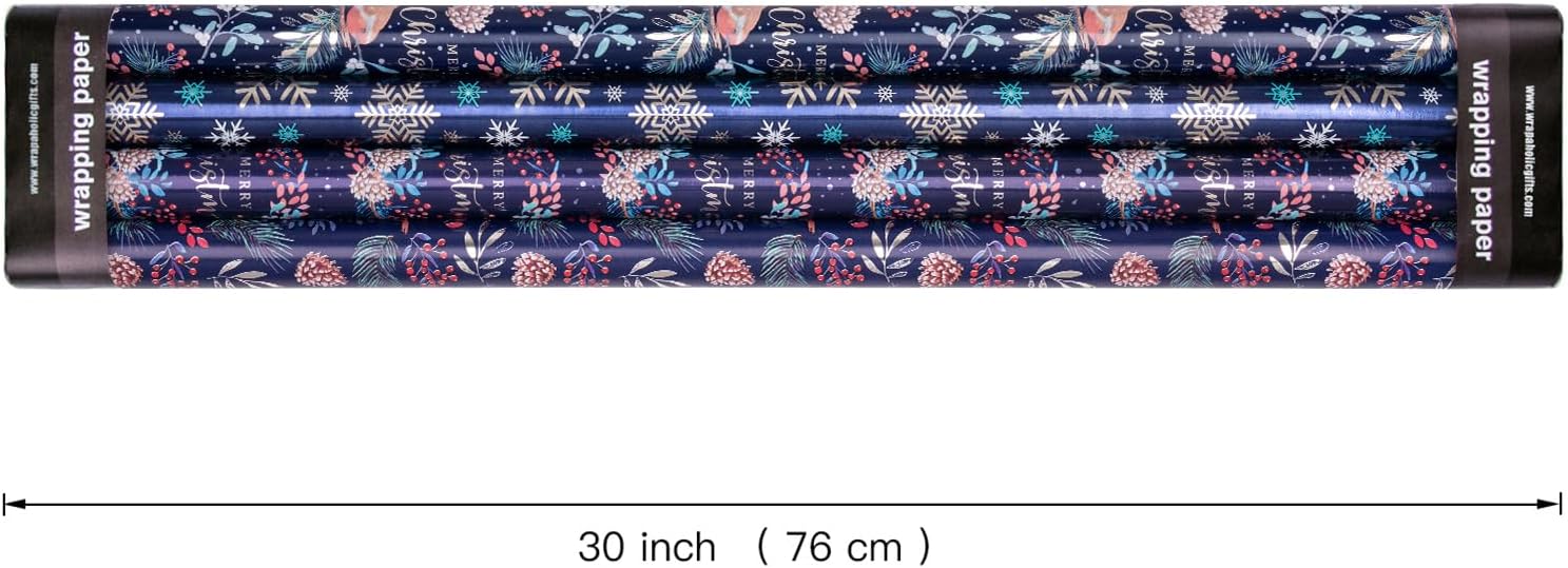 WRAPAHOLIC 30 Inch Christmas Wrapping Paper Roll - Jumbo Roll Drak Blue Bird, Christmas Garland and Snowflake Holiday Collection with Metallic Foil Shine - 4 Rolls - 30 Inch x 120 Inch Per Roll