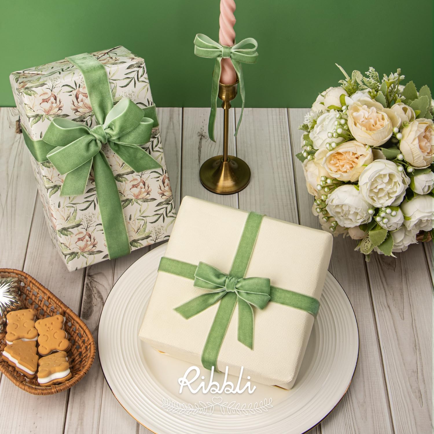 Ribbli Sage Green Velvet Ribbon 5/8 Inches Continuous10 Yard Spool Spring Moss Christmas Ribbon for Gift Wrapping Crafts Home Decor