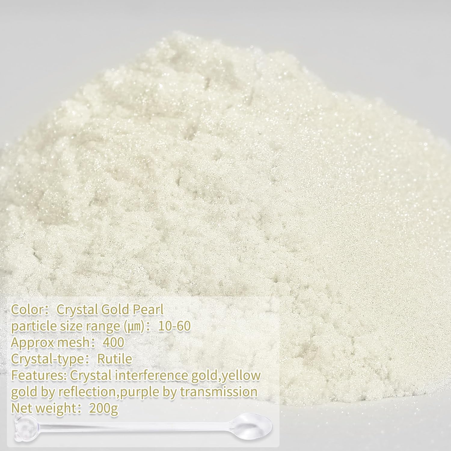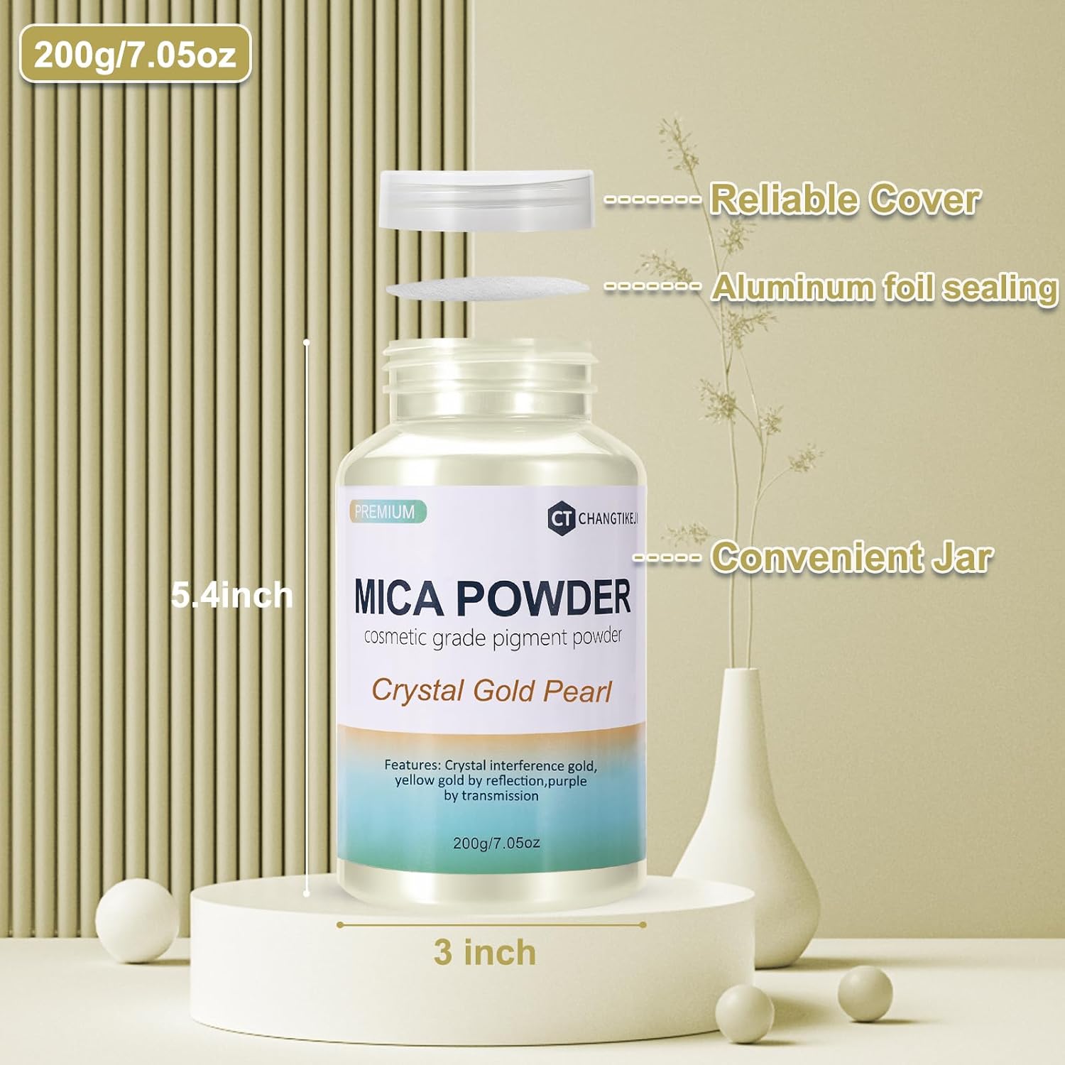 - 【Super Surprise Color Combination】:Our Crystal Gold Pearl mica powder net weight is 200g/7.05oz large bottle. Just a little mica powder can bring a very gorgeous effect.With its shiny surface,this mica powder pigment provides a gorgeous and lasting effect for your artistic creation.