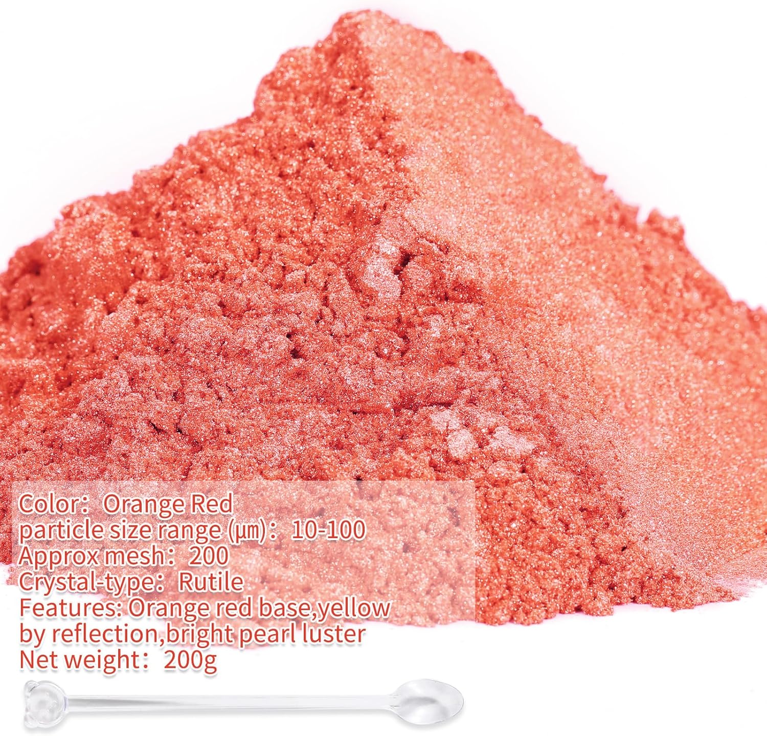 - 【Super Surprise Color Combination】:Our Orange Red mica powder net weight is 200g/7.05oz large bottle. Just a little mica powder can bring a very gorgeous effect.With its shiny surface,this mica powder pigment provides a gorgeous and lasting effect for your artistic creation.