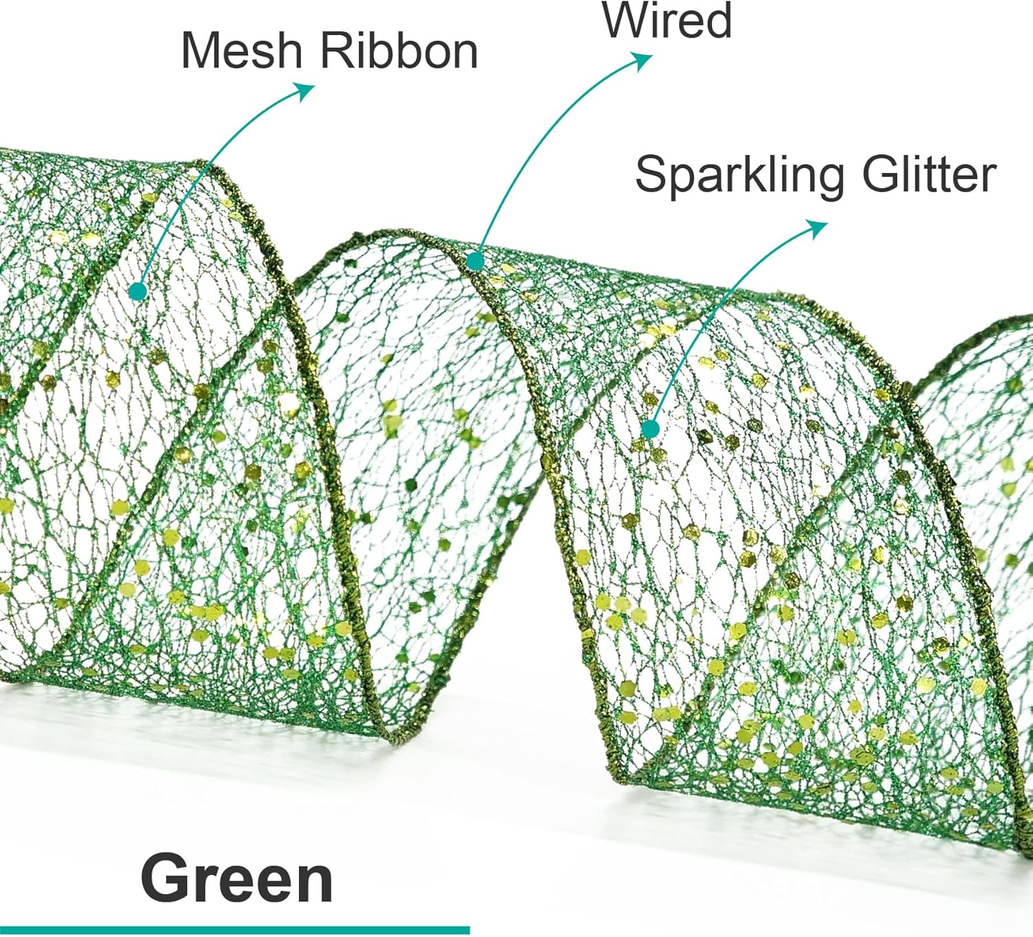 - GREAT WORKMANSHIP - Our Sparkling Glitter Mesh Wired Ribbon 6" has a density weave so you wonโt find any loose edges. You wonโt find any fraying ends or loose strings anywhere, making our Sparkling Glitter Mesh Wired Ribbon 6" Green color perfect for high-end and professional DIY works and Crafts.