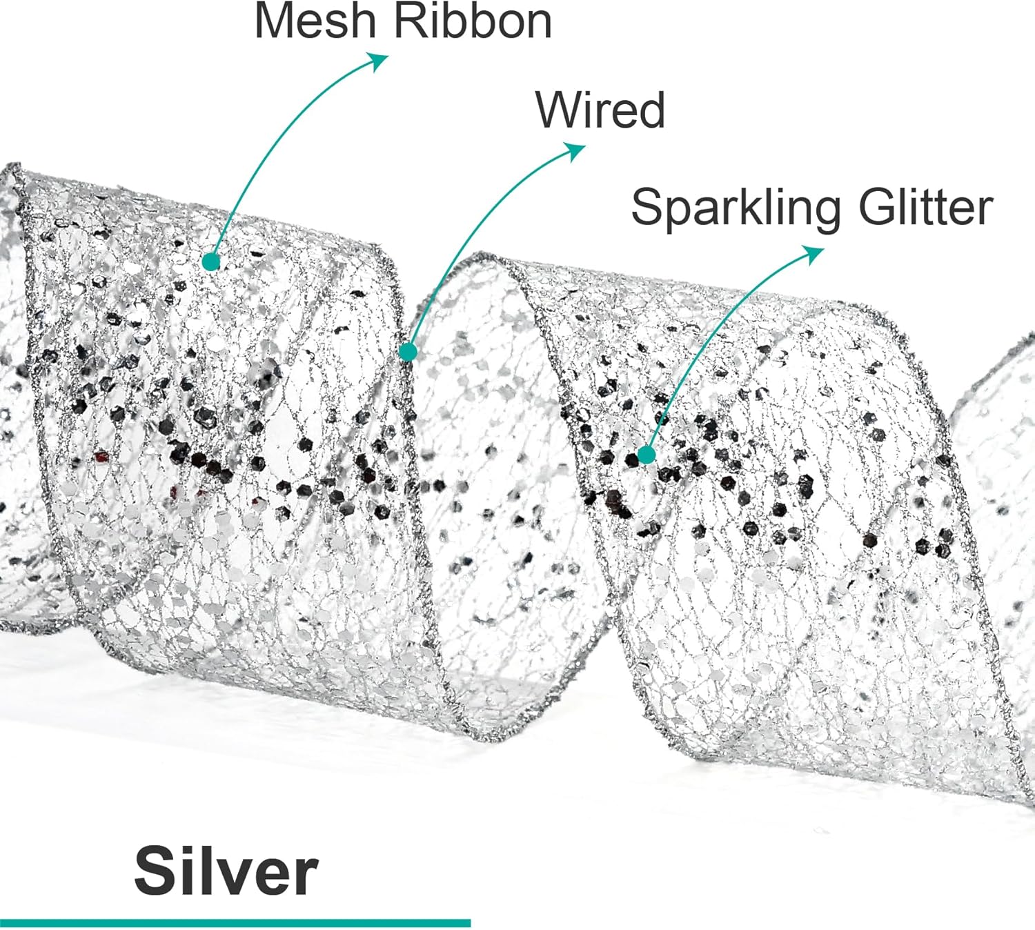 - GREAT WORKMANSHIP - Our Sparkling Glitter Mesh Wired Ribbon 2.5" has a density weave so you wonโt find any loose edges. You wonโt find any fraying ends or loose strings anywhere, making our Sparkling Glitter Mesh Wired Ribbon 2.5" Silver color perfect for high-end and professional DIY works and Crafts.