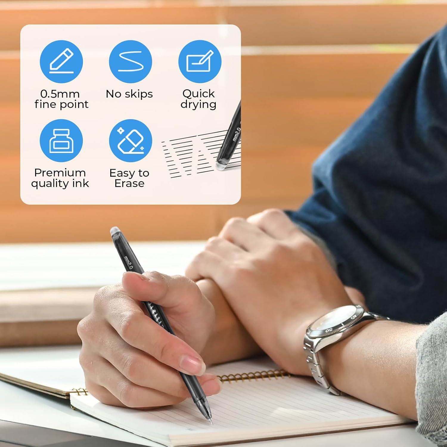 - 0.5mm Black Erasable Gel Pens: The erasable gel ink comes with 0.5mm tip and black ink colors. It's non-toxic, acid-free, and non-bleeding, making it perfect for all your writing needs. Plus, the eraser is conveniently located at the top of the pen tip, retractable by simply pressing down on the clip. These pens write like traditional gel pens but erase just like pencils.