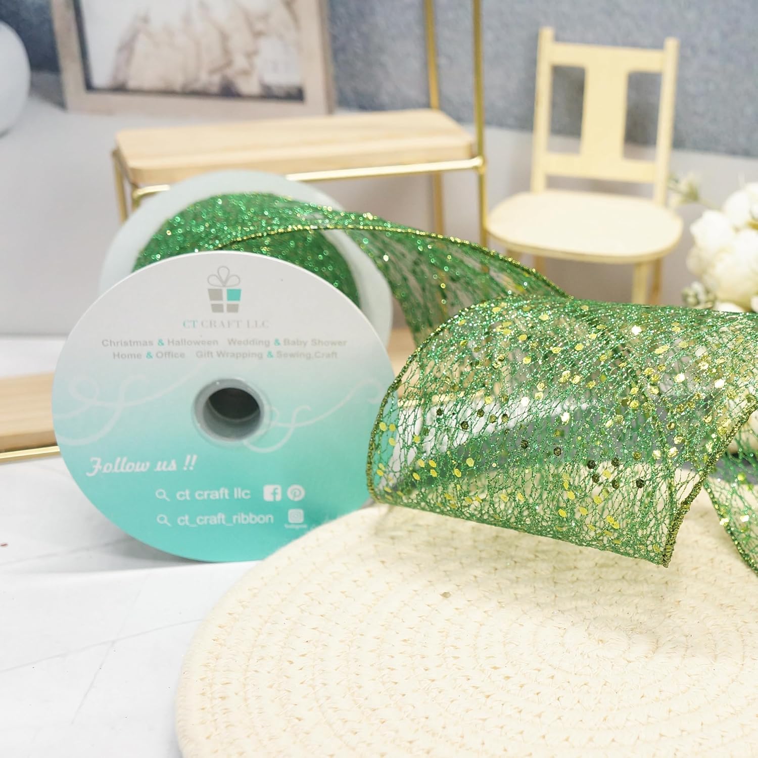 CT CRAFT LLC Sparkling Glitter Mesh Wired Ribbon 4" x 10 Yards Green for Christmas Home Decor Bow Gift Wrapping DIY Crafts Wreath