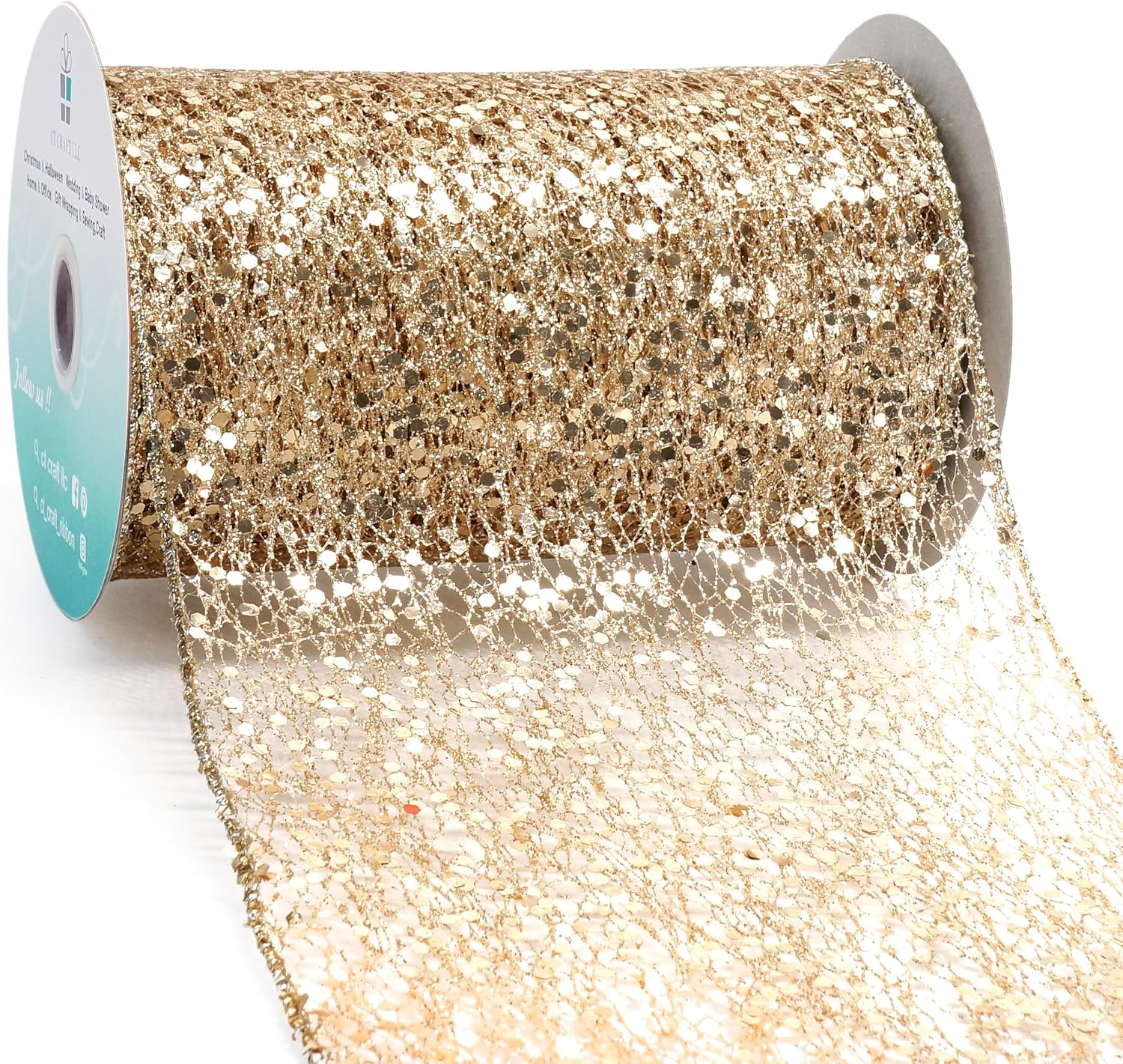 - GREAT WORKMANSHIP - Our Sparkling Glitter Mesh Wired Ribbon 6" has a density weave so you wonโt find any loose edges. You wonโt find any fraying ends or loose strings anywhere, making our Sparkling Glitter Mesh Wired Ribbon 6" Champagne Gold color perfect for high-end and professional DIY works and Crafts.
