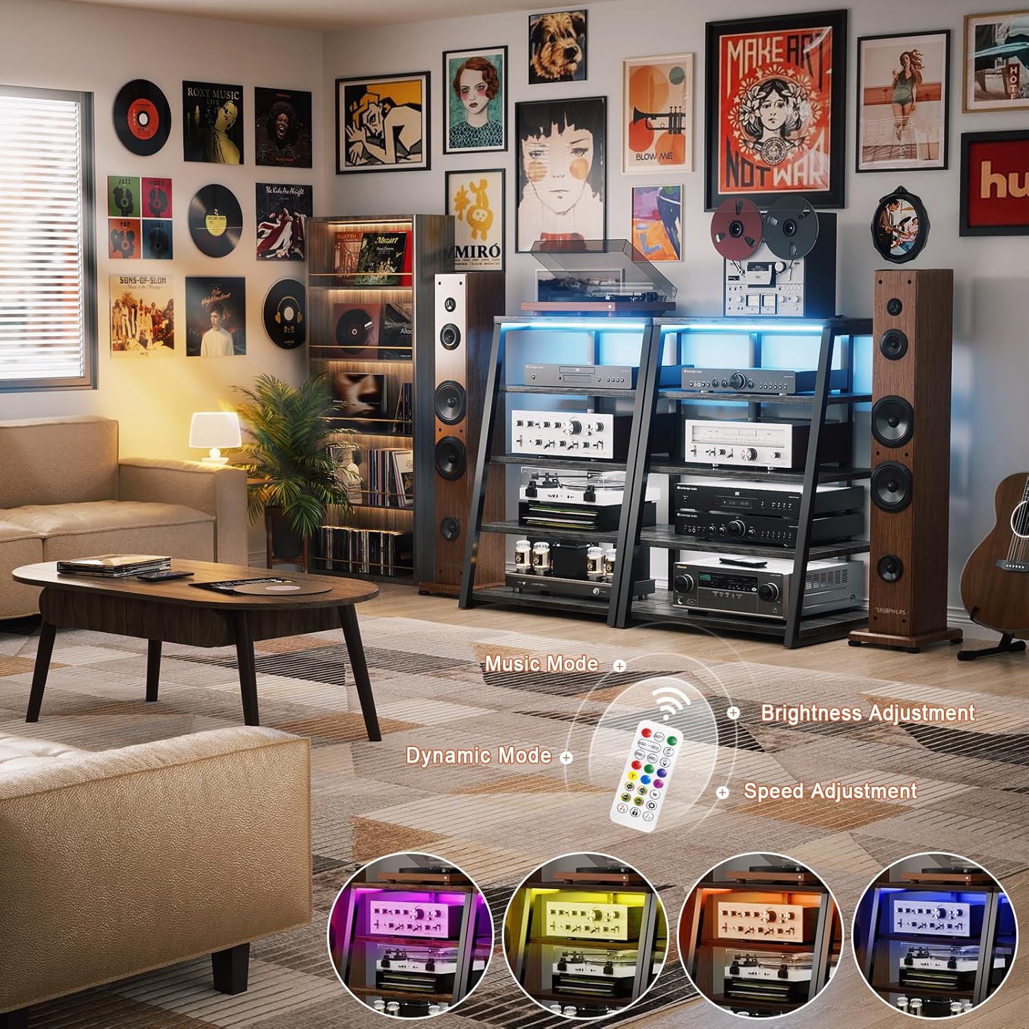 - Built-in Power Strips & LED Lights - Built in a power station including 4 receptacles plus 2 USBs, this AV media stand will make the charging of your electronics more convenient. It will save you space for adding power strips. The lighting is good for the mood setting. Static mode and 20 dynamic modes are flexible options for your music, gaming, and movie vibes.