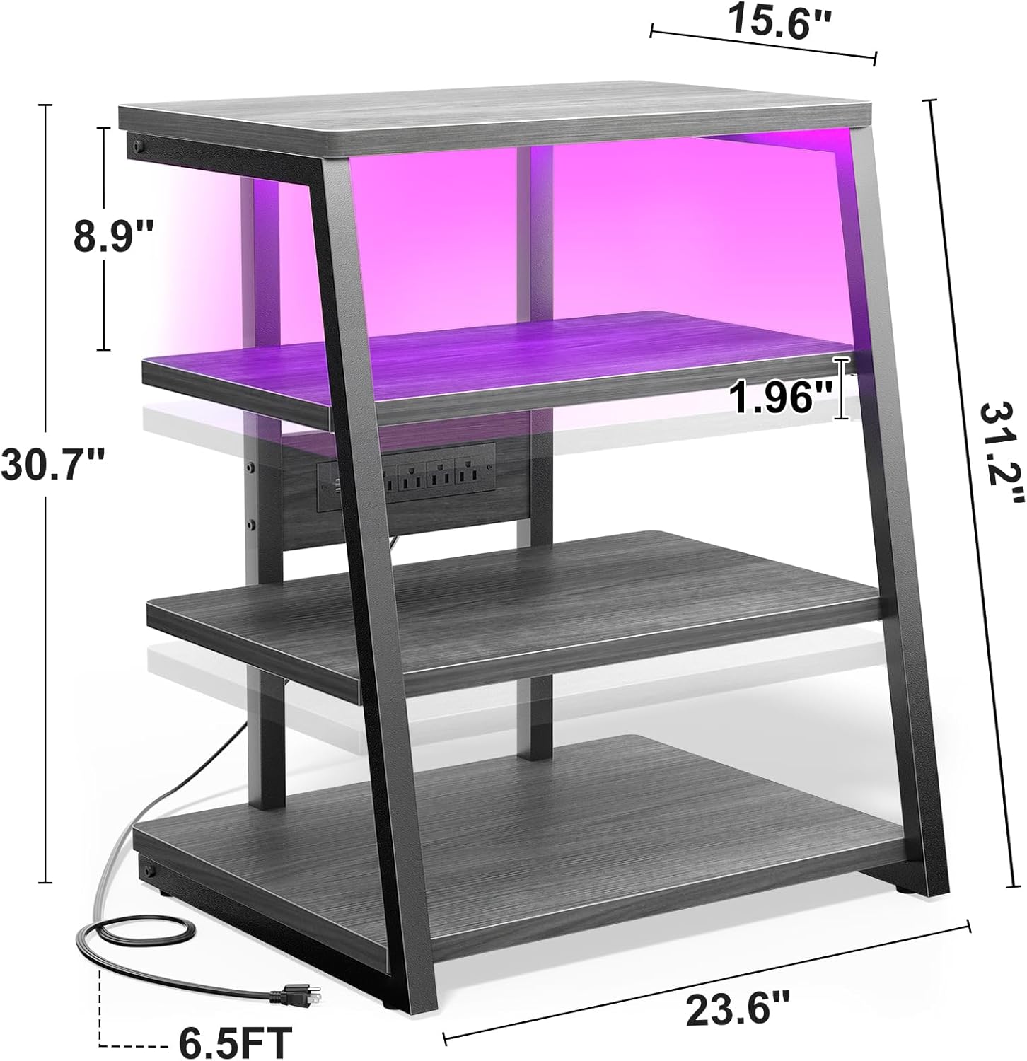 AV Media Stand with Outlets, Media Console with LED Lights, Stereo Racks and Stands with Storage Shelves, Media Audio Tower Stand, Light Grey Walnut