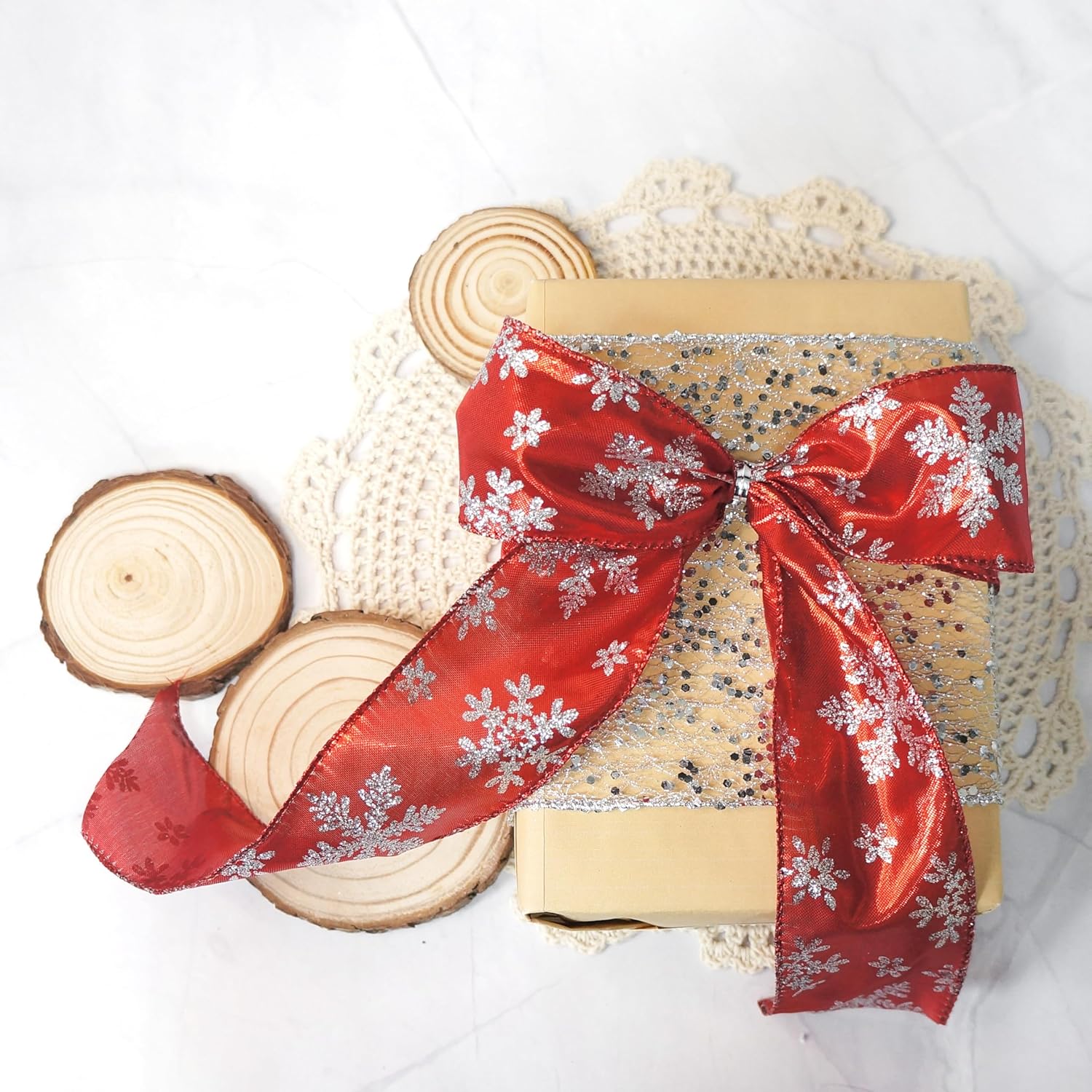 - EASY TO USE - The 25-yard long red Metallic with Silver Glitter Snowflake Wired Ribbon 2.5" is enough for all the decorating and accenting your DIY Crafts. The red Metallic with Silver Glitter Snowflake Wired Ribbon 2.5" is easy to use and wonโt tangle. It can be tied or glued on gift packages and DIY craft projects such as car and chair bow, wreath, flower bouquet.