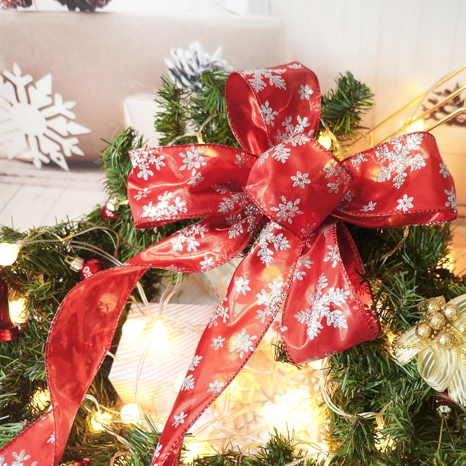- OCCASION - Our red Metallic with Silver Glitter Snowflake Wired Ribbon 2.5" are very easy to match and suitable for birthdays, party decorations, Mother's Day, Valentine's Day, Easter, Independence Day, Halloween, Christmas, New Year's gifts, Wedding decorations, Baby showers etc.