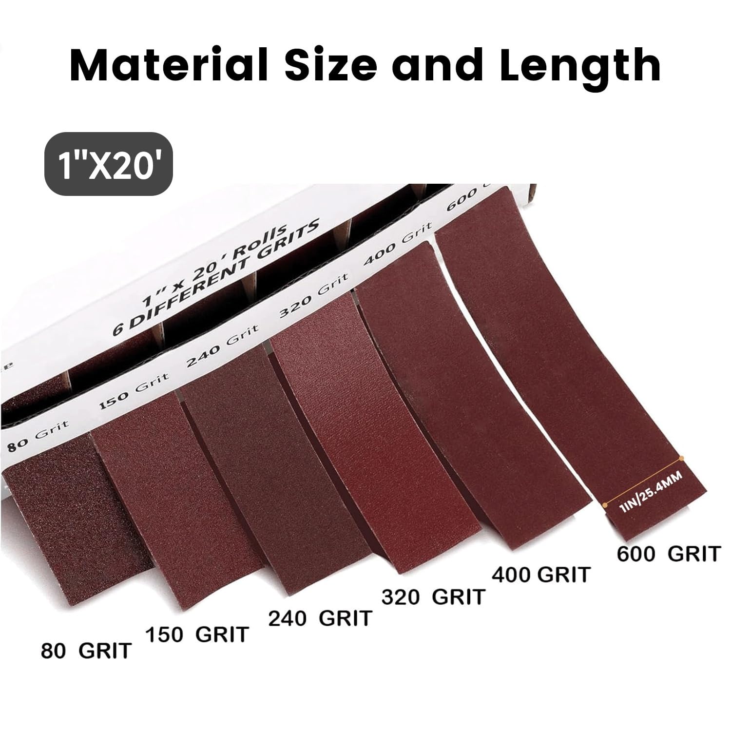 Emery Cloth Roll,6 Grits 1'' x 20FT Sandpaper Roll with Dispenser,80 150 240 320 400 600 Grit Sand Assortment,Sanding Paper Roll & Sandpaper Sheets for Metal Auto Wood Dry&Wet Polishing.(6Rolls 20FT)
