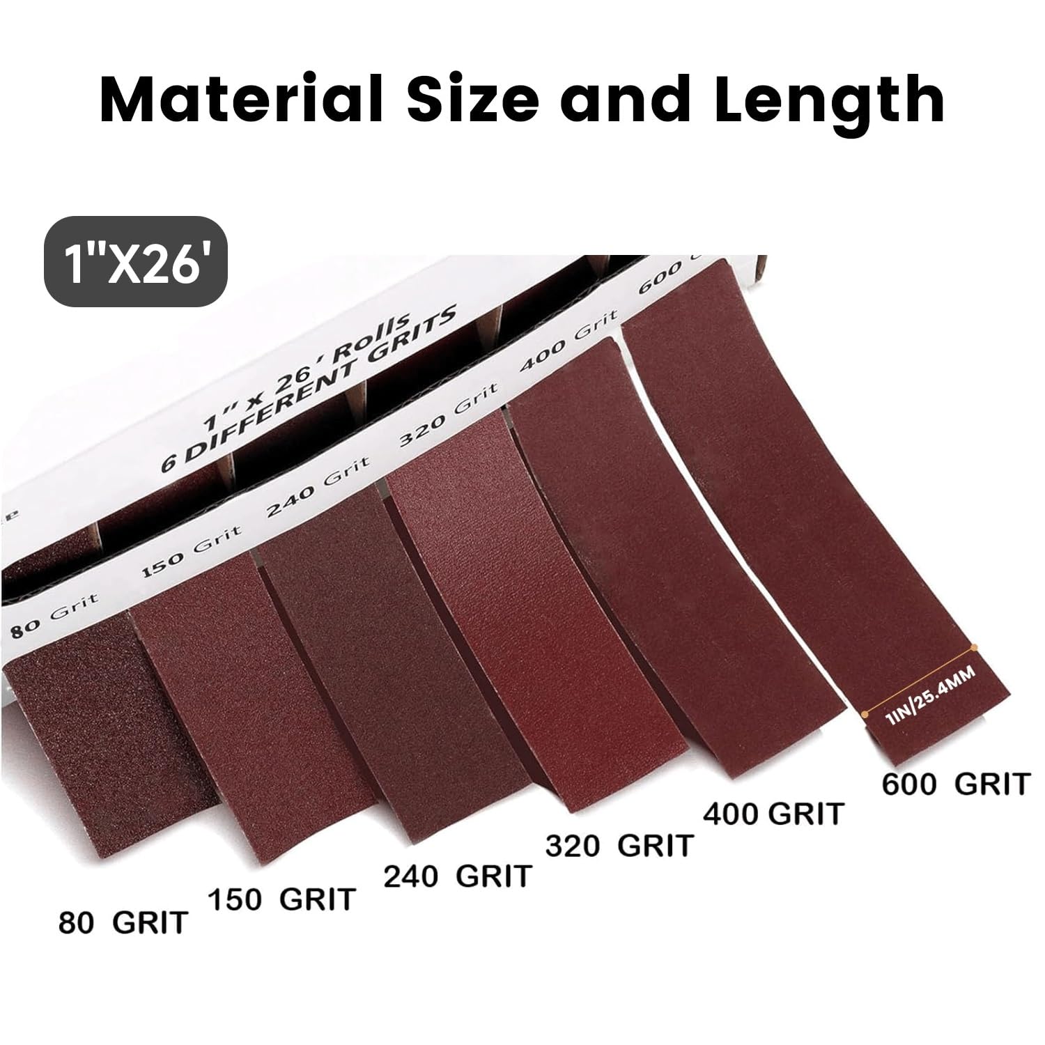 Emery Cloth Roll,6 Grits 1'' x 26FT Sandpaper Roll with Dispenser,80 150 240 320 400 600 Grit Sand Assortment,Sanding Paper Roll & Sandpaper Sheets for Metal Auto Wood Dry&Wet Polishing.(6Rolls 26FT)