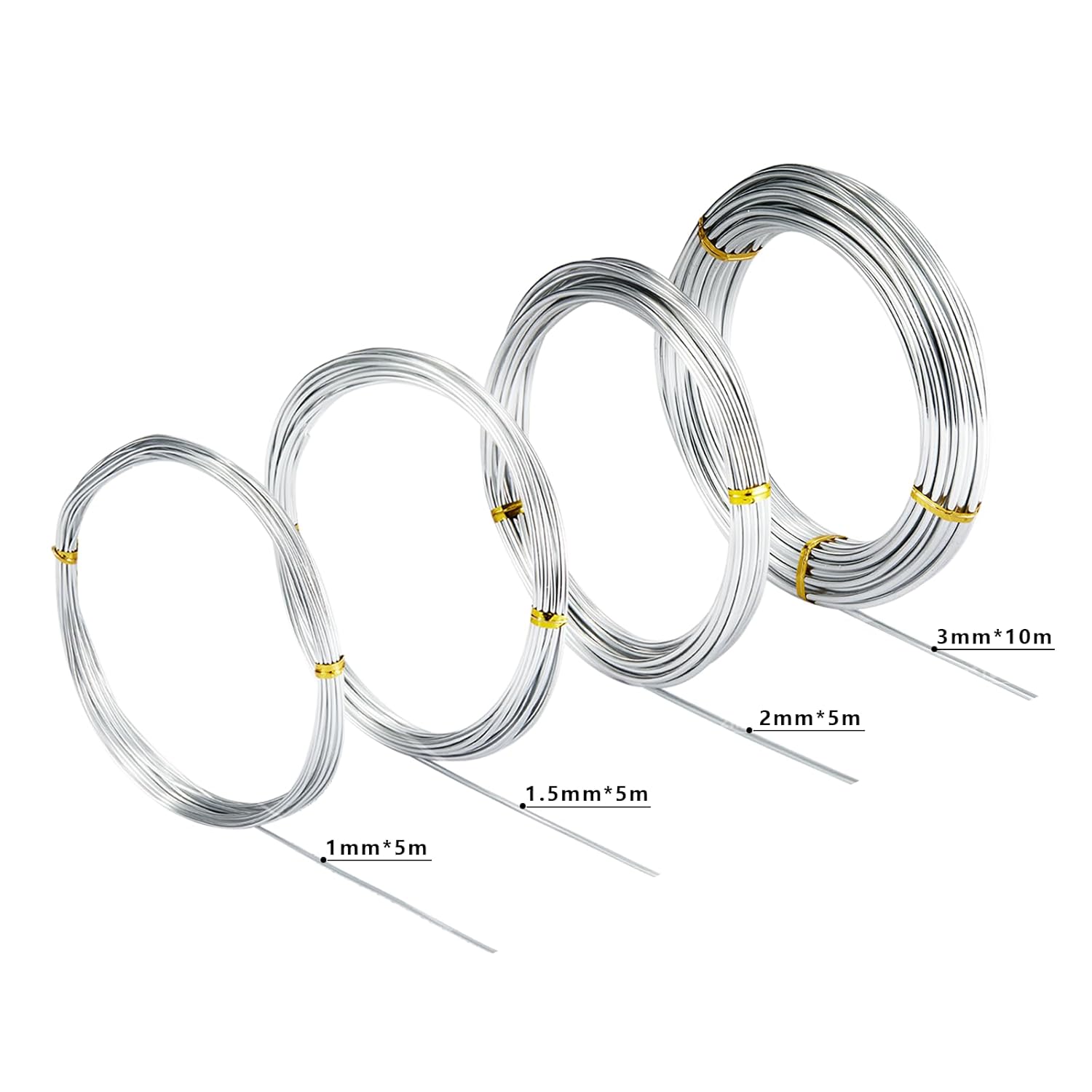 4 Pcs Aluminum Craft Wires, 3mm*10m, 2mm*5m, 1.5mm*5m, 1mm*5m, Bendable Craft Wire for Sculpting Armature DIY Jewelry Making (Silver)