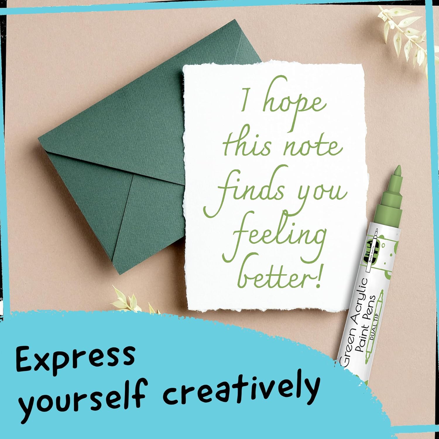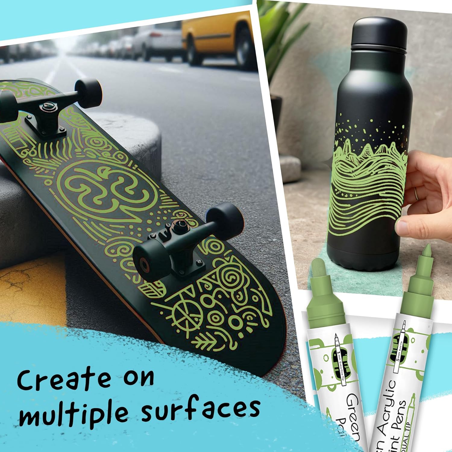 4 Dual Tip Green Paint Pen Metallic - Fine Tip & Medium Acrylic Paint Markers - Green Marker for Metal, Wood, Rock Painting, Canvas, Ceramic, Glass, Fabric, Leaf and Plastic - Water-based Ink