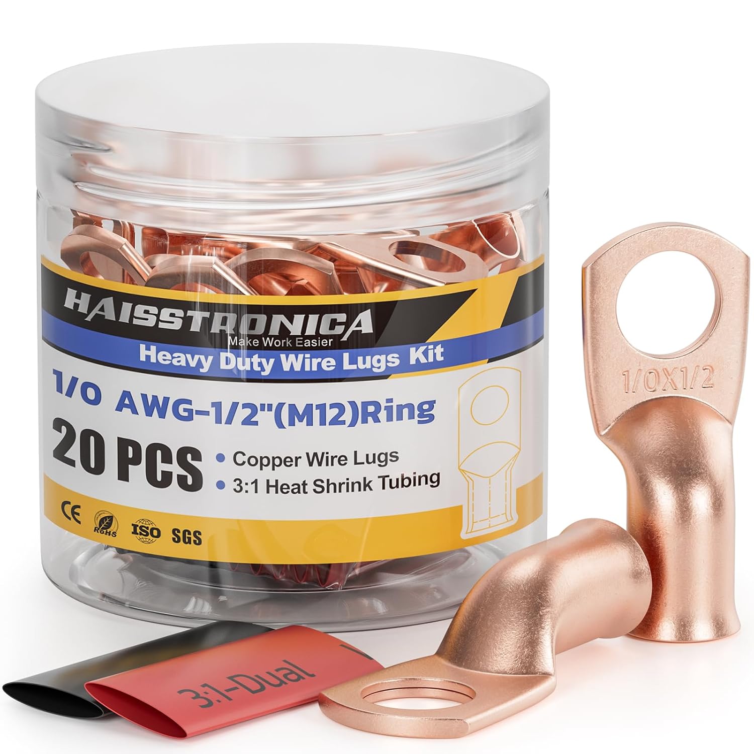 - Copper Lugs and Heat Shrink Tubing Kit: 10 PCS 1/0 AWG - 1/2"(M12) ring terminals copper wire lugs and 10 PCS 3:1 Dual Wall Adhesive Heat Shrink Tubing(5 black and 5 red), and comes with a sturdy clear plastic jar that make battery cable ends easy storage