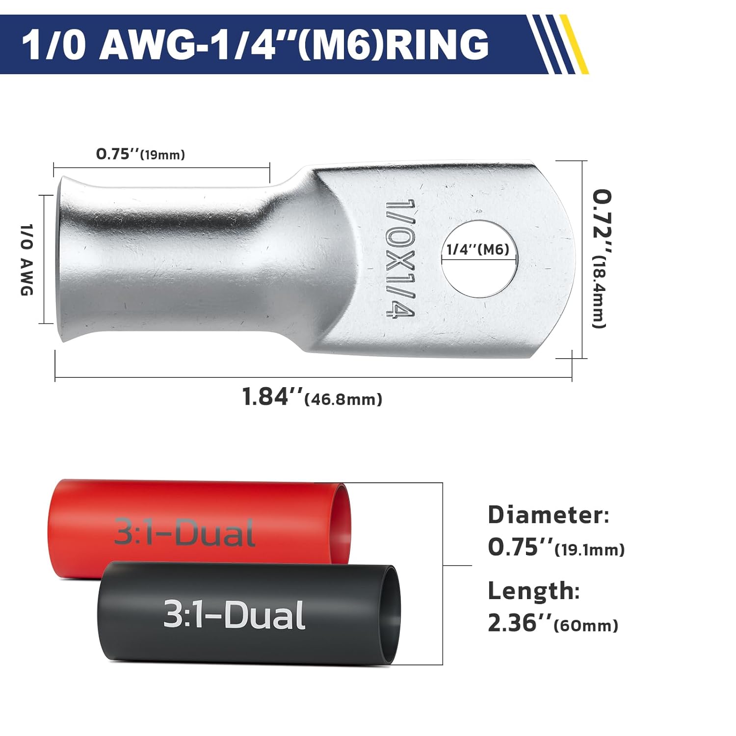 - Tinned Copper Lugs and Heat Shrink Tubing Kit: 10 PCS 1/0 gauge (AWG) - 1/4" (M6) ring terminals tinned copper wire lugs and 10 PCS 3:1 Dual Wall Adhesive Heat Shrink Tubing(5 black and 5 red), and comes with a sturdy clear plastic jar that make battery cable ends easy storage