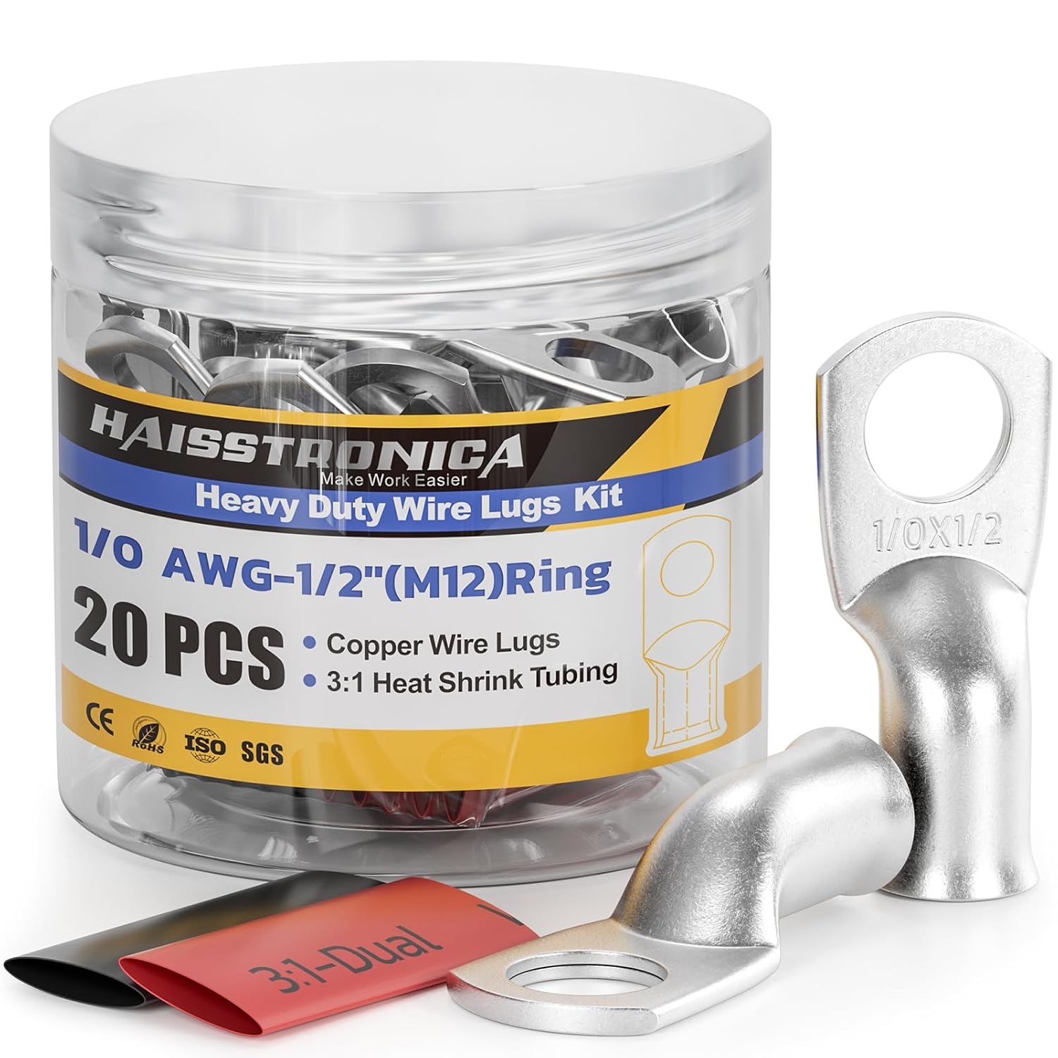 - Tinned Copper Lugs and Heat Shrink Tubing Kit: 10 PCS 1/0 gauge (AWG) - 1/2" (M12) ring terminals tinned copper wire lugs and 10 PCS 3:1 Dual Wall Adhesive Heat Shrink Tubing(5 black and 5 red), and comes with a sturdy clear plastic jar that make battery cable ends easy storage