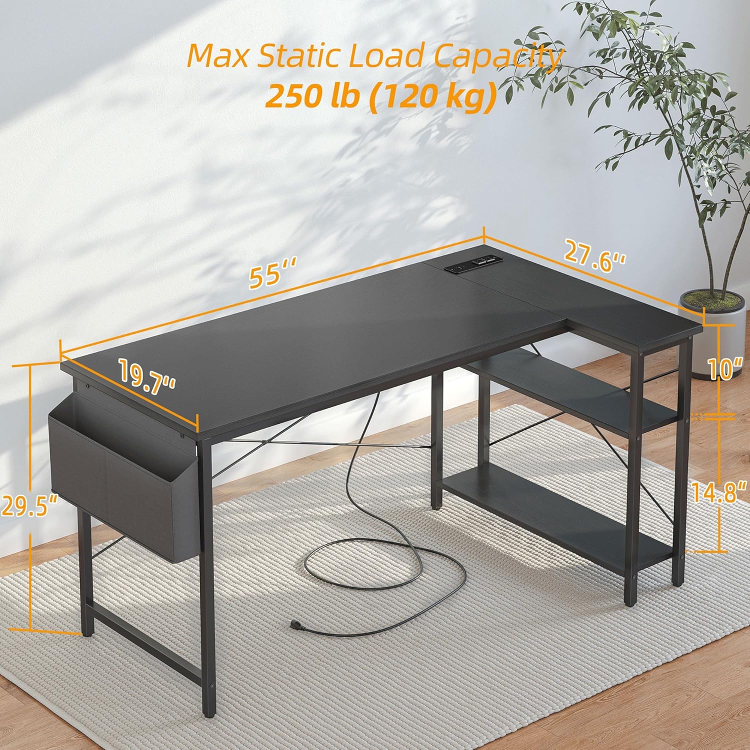 TIQLAB L Shaped Computer Desk with Power Outlets, 55 Inch Small Corner Desk with Reversible Shelves, Gaming Desk Computer Table Study Writing Table for Home Office Bedroom Small Space, Black