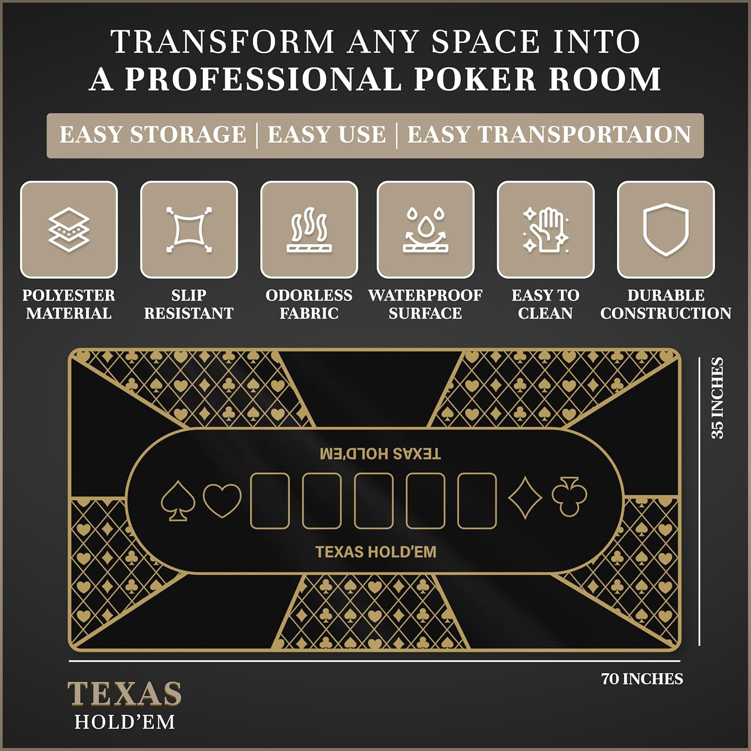 - UNZIP, ROLL & PLAY - Our poker table mat allows for a quick and hassle-free setup. When the game is over, it can be conveniently rolled up and stored in the included carrying case, saving you space and time.
