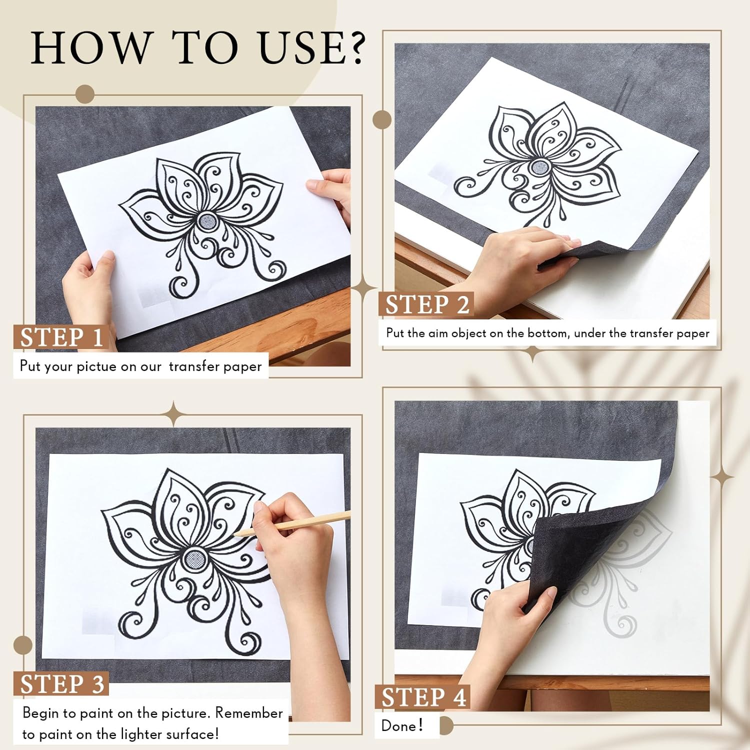 - Quality Paper Material: the graphite transfer paper for wood is made of quality paper material, this material facilitates easy and flexible transfer, keeping your projects clean and crisp, and mirroring your designs nicely