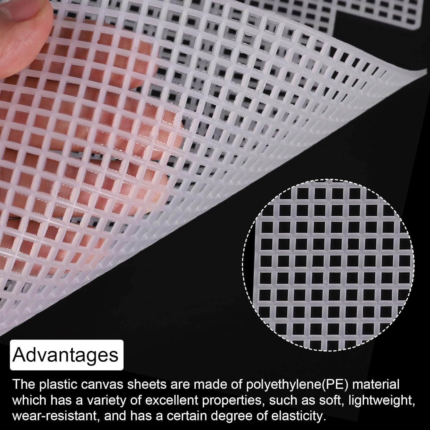 - The plastic canvas sheets are made of polyethylene(PE) material which has a variety of excellent properties, such as soft, lightweight, wear-resistant, and has a certain degree of elasticity.