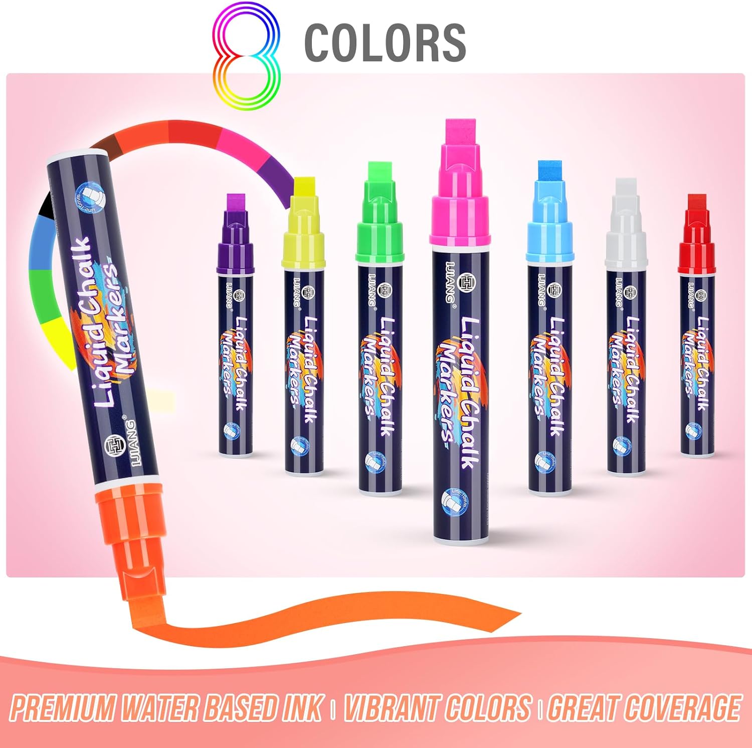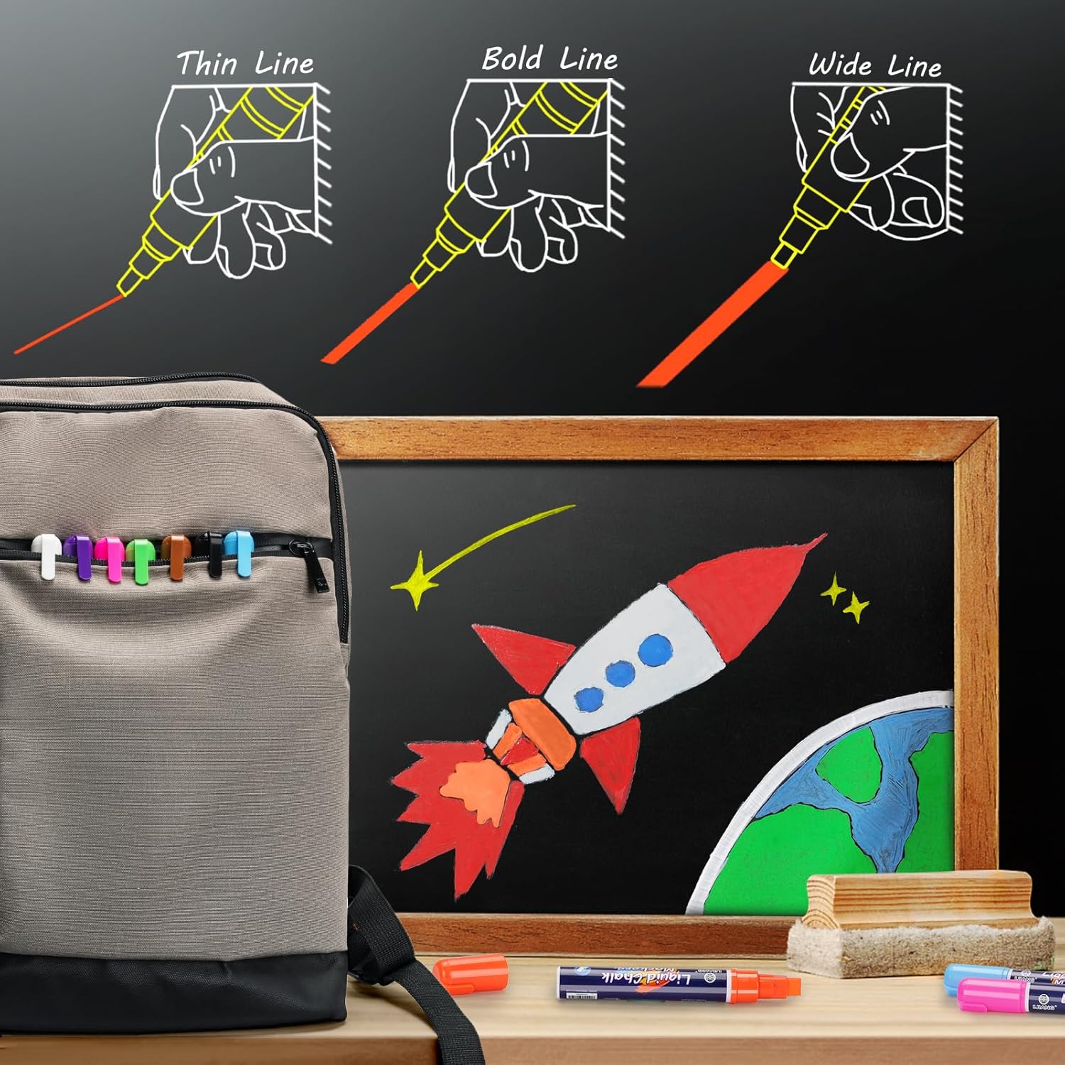 - Innovative Design Of The 3-In-1 Nib: 8 Vibrant color jumbo chalk markers, each with a 10mm 3-in-1 nib in vibrant colors;The chalk pen have a 3-in-1 nib for all your drawing needs, and rectangular nib allows you to adjust the angle of the nib to get wide, thick and thin lines;product contains eight vibrant colors: purple, blue, green, orange, pink, red,yellow, white