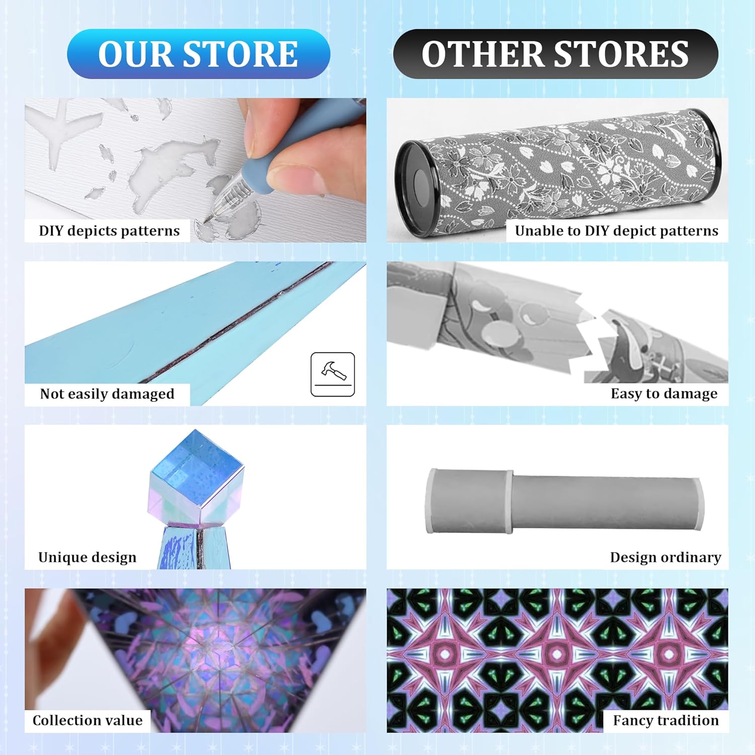 - [DIY production process]:If you want to know the production process,please contact me.I will provide you with a detailed production tutorial.Don't worry,the whole carving process is easy and enjoyable.When you are immersed in the fun of DIY,please be careful not to let the glue accidentally touch the inner mirror of the acrylic to ensure the perfection of the work. If you encounter any questions or challenges during the production process, please feel free to contact me.I am here and happy to answer everything for you.The pattern on the kaleidoscope needs to be carved by you