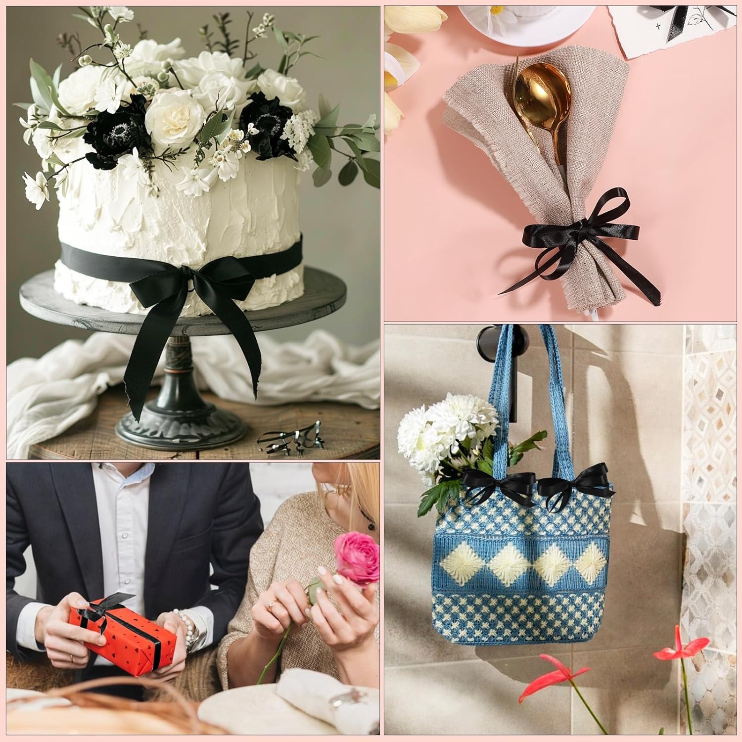 - 【Wide Application】Black satin ribbon can be used to wrap gifts and make your gifts look more beautiful. In addition, the pink ribbon is also suitable for wedding decoration, flower bouquet, balloons, wreaths, hair bows, cake packaging, craft project, home decoration, etc.