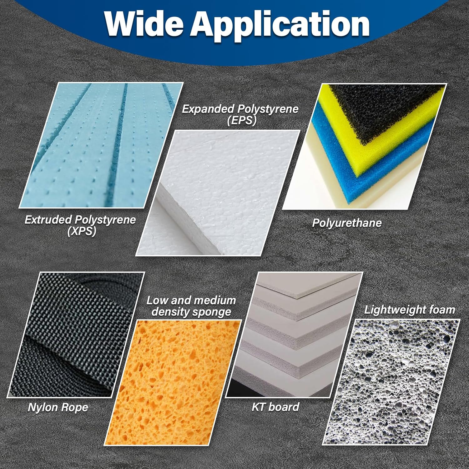 - 【WIDER RANGE OF USE】The electric hot knife foam cutter boasts versatility in cutting various materials. Beyond pearl cotton, KT board, EPS, sponge, EPP, foam glass, it effortlessly slices through medium and low density foam, nylon, synthetic fabric and cloth. This tool is particularly well-suited for professionals due to its wider range of applications.