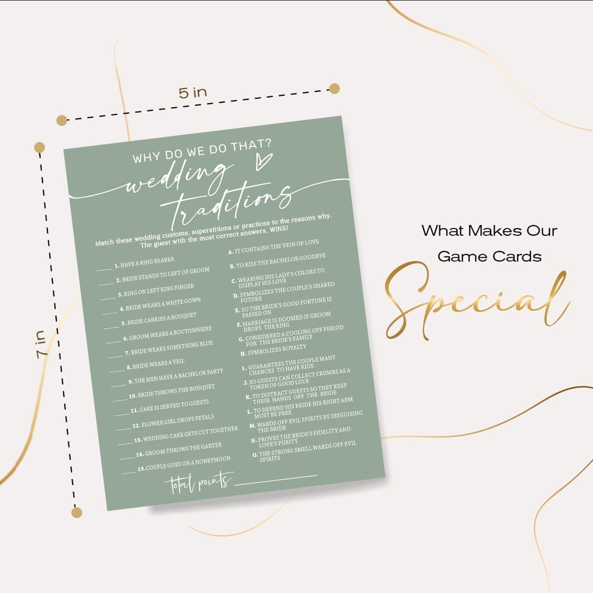 Bridal Shower Games Cards, Wedding Traditions Why Do We Do That, 25 Game Cards with 1 Answer Card, Engagement Party Wedding Games for Guests, Minimalist Green Wedding Party Supplies - C08
