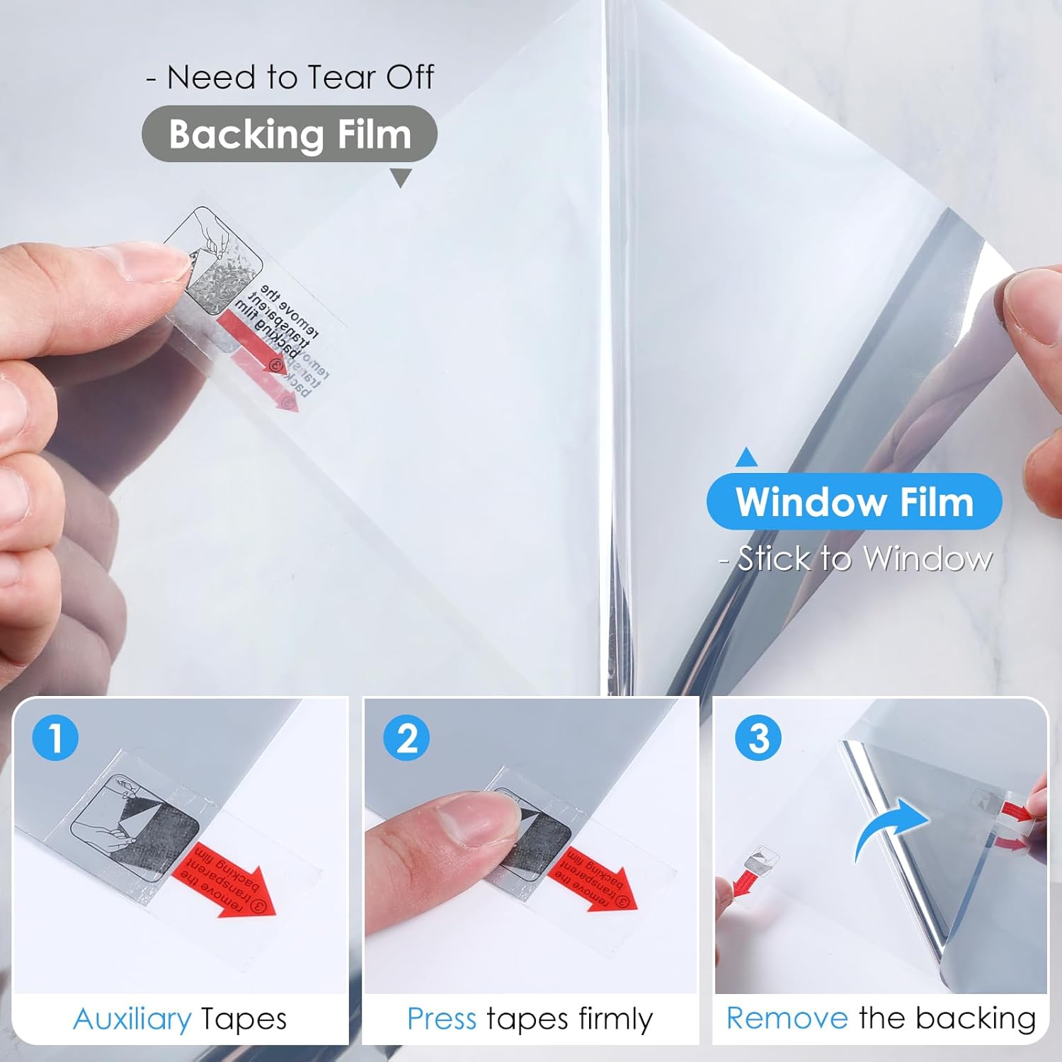 - Essential Installation Tip: Start with clean and smooth glass. Cut the mirror film to size, Use auxiliary tapes to peel off the backing. Generously spray water on both the adhesive side and the glass, continuing to spray water to position the Homein window tint. Smooth out the bubbles