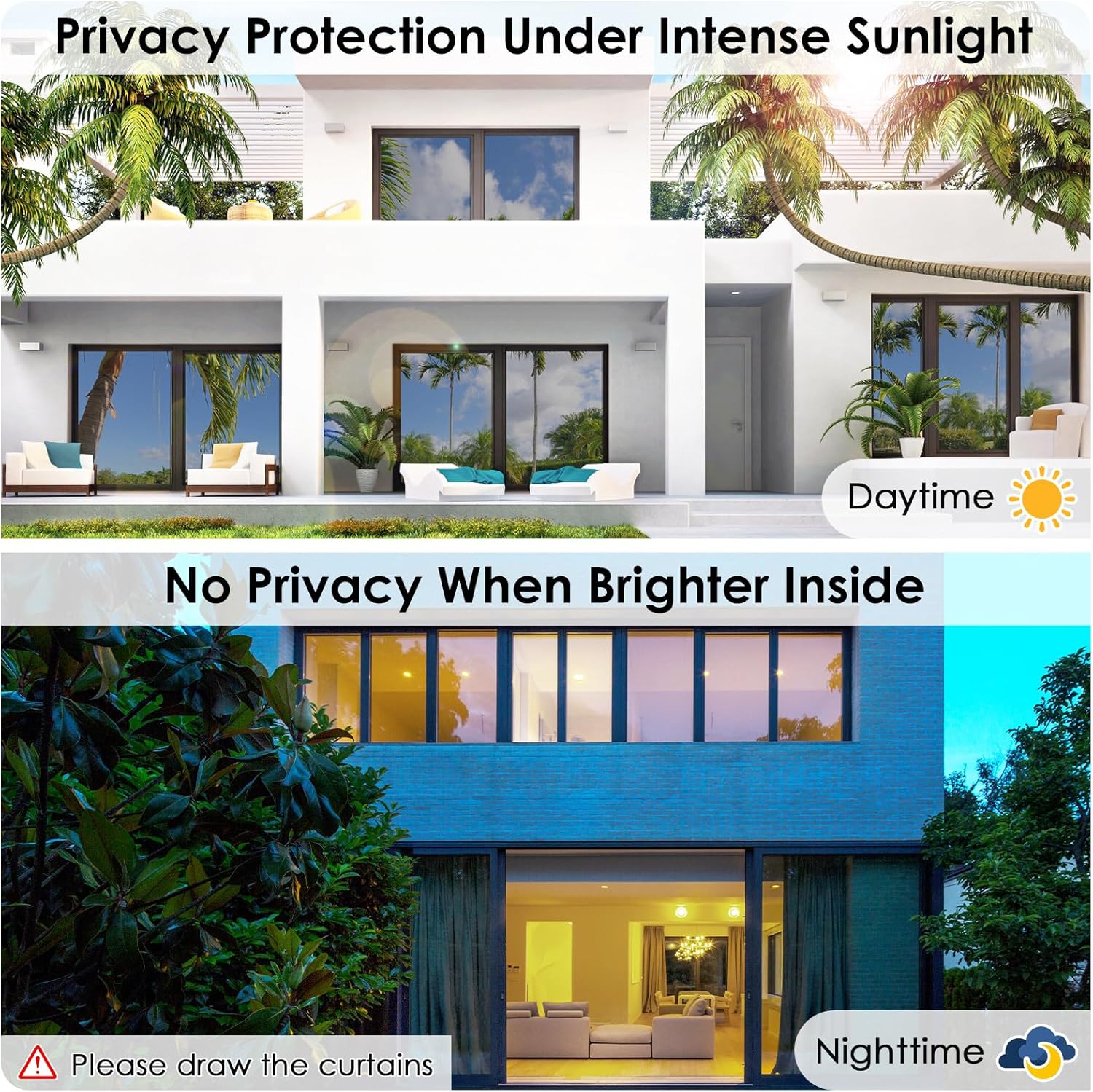 - Daytime Privacy Protection: One way window film effectively protect privacy during the day, by using the light difference between indoors and outdoors to create a one-way privacy effect. However, at night, when indoor lights are on, the effect reverses. Use curtains at night for privacy