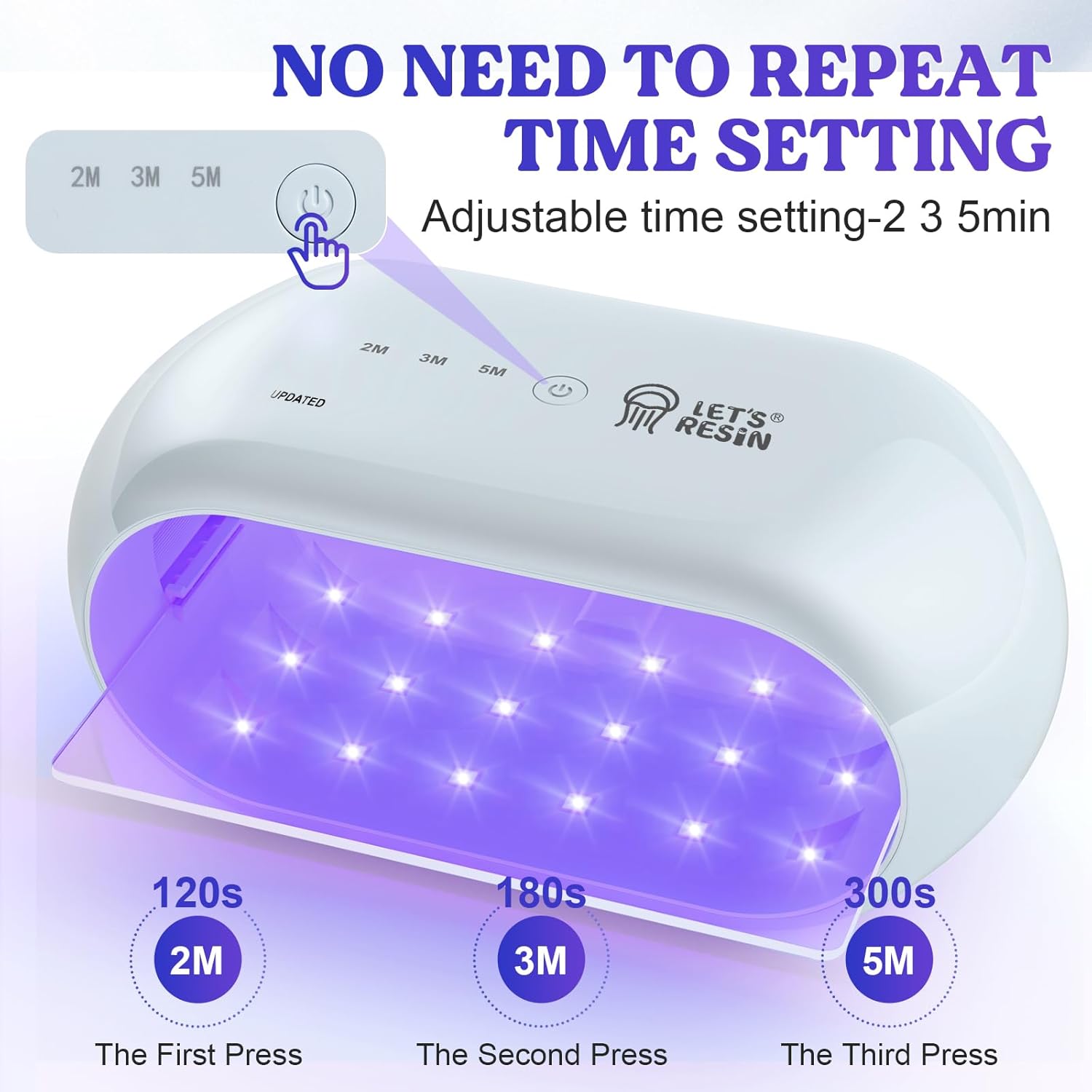 - Double Time Settings -2, 3, 5 min Timing Options:To cater to UV resin enthusiasts, we've extended curing times from 60, 90, and 150 seconds to 2, 3, and 5 minutes. Longer curing time and you don't have to sit and watch a resin mold for the whole 5 minutes to keep resetting the timer.