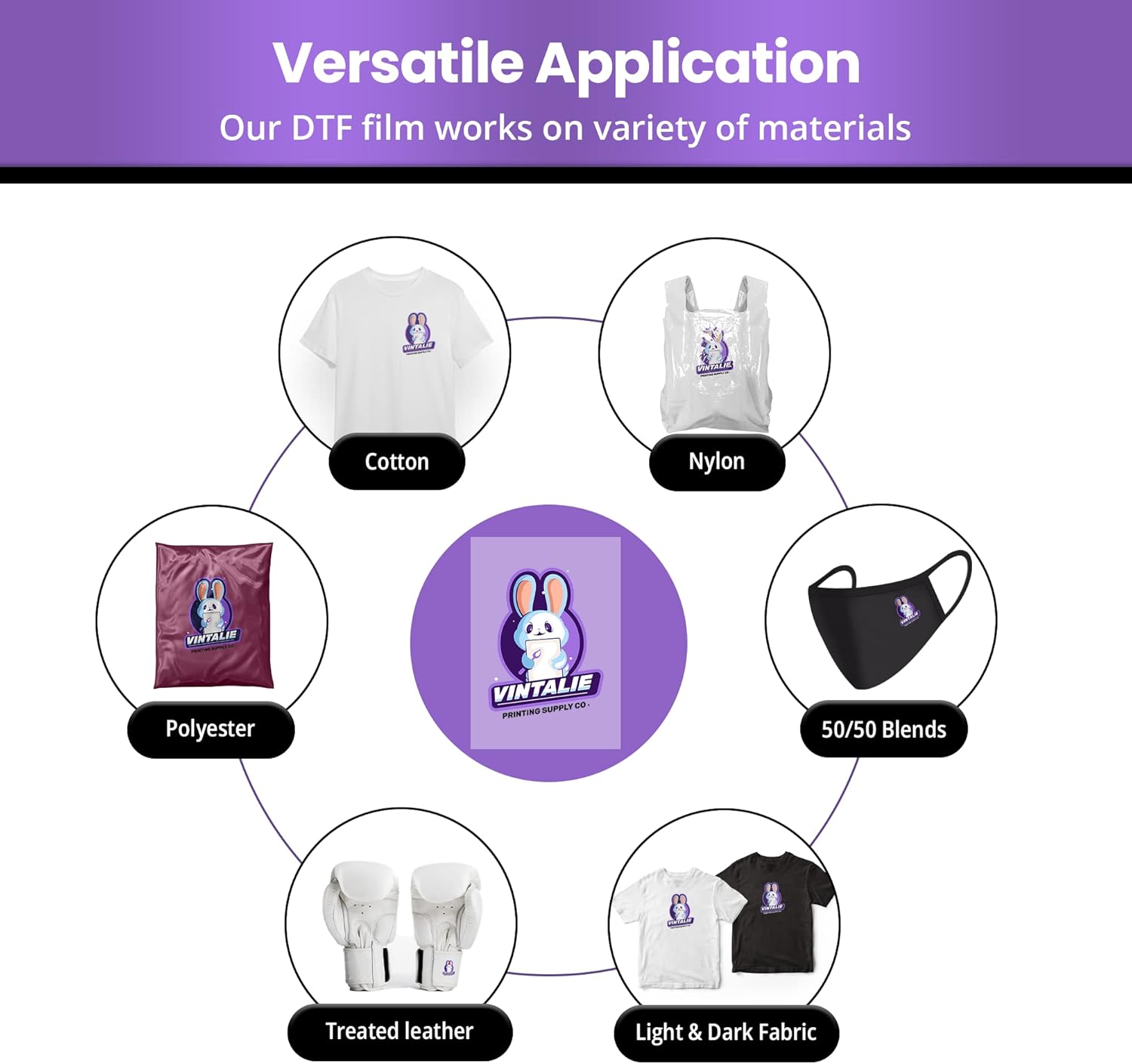 - ✅ [VERSATILE] – Vintalie DTF film can be used on both white and black fabrics and any color in between. This is true when used with DTF printer, DTF inks, DTF powder and using the correct tools. If you are using sublimation hacks or DTF converted printers please make sure to test beforehand. Sublimation hacks used incorrectly will not work. Our film can be printed on variety of fabrics such as cotton, nylon, polyester, treated leather and more when used with the correct tools.