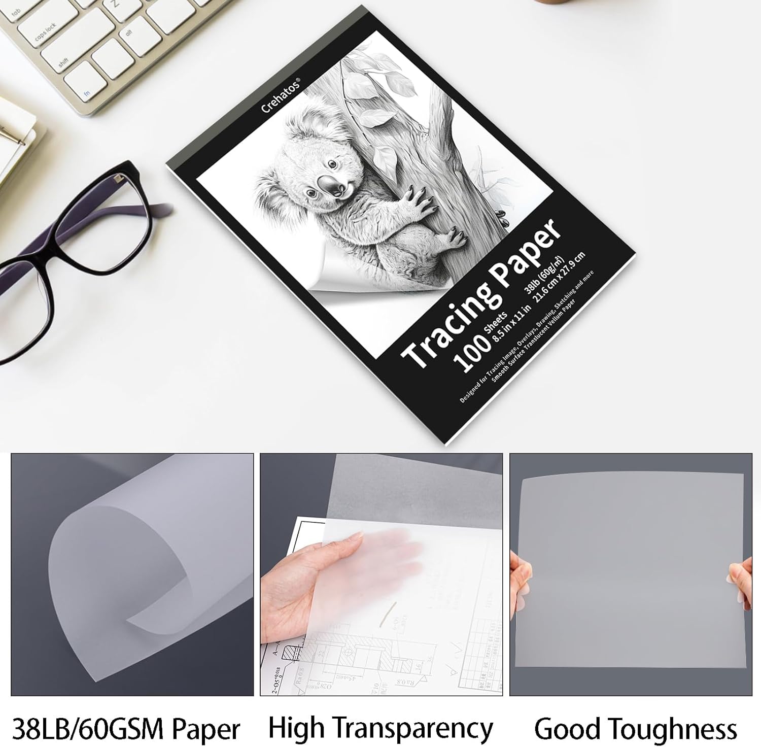 Crehatos 8.5" x 11" Tracing Paper, Translucent Tracing Pad, 100 Sheets 38lb/60gsm Vellum Art Paper