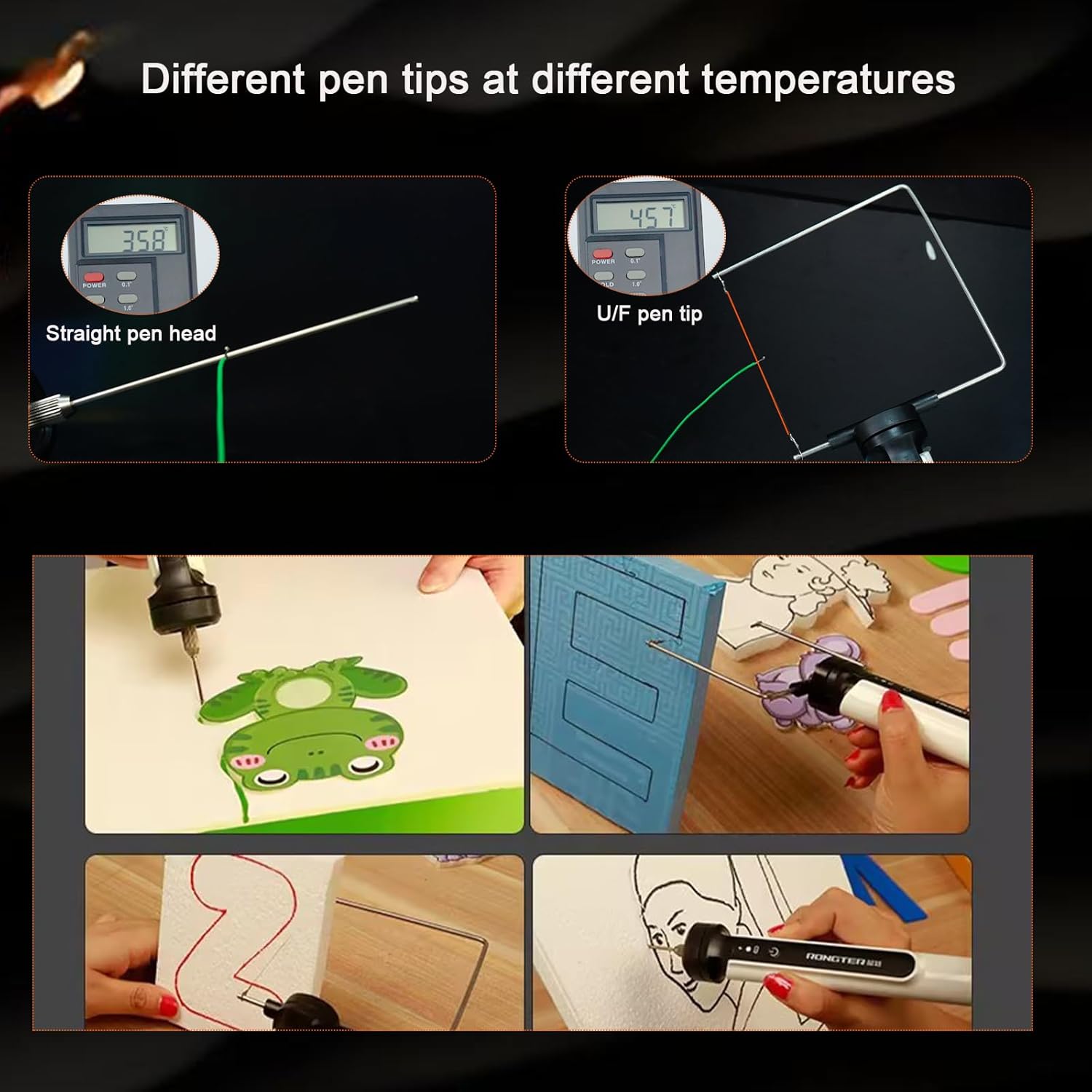 - 【Smooth and Efficient Cutting】Rongter hot wire foam cutter is FCC certified, heats up faster and more evenly than normal electric heating pens, The U-shaped tip can be heated up to 842℉/450℃ during use, and the 4in tip can be heated up to 662℉/350℃. The hot wire cutting pen can cut foam block from any angle smoothly and efficiently just like butter, seals the edges clearly, and eaves No Debris