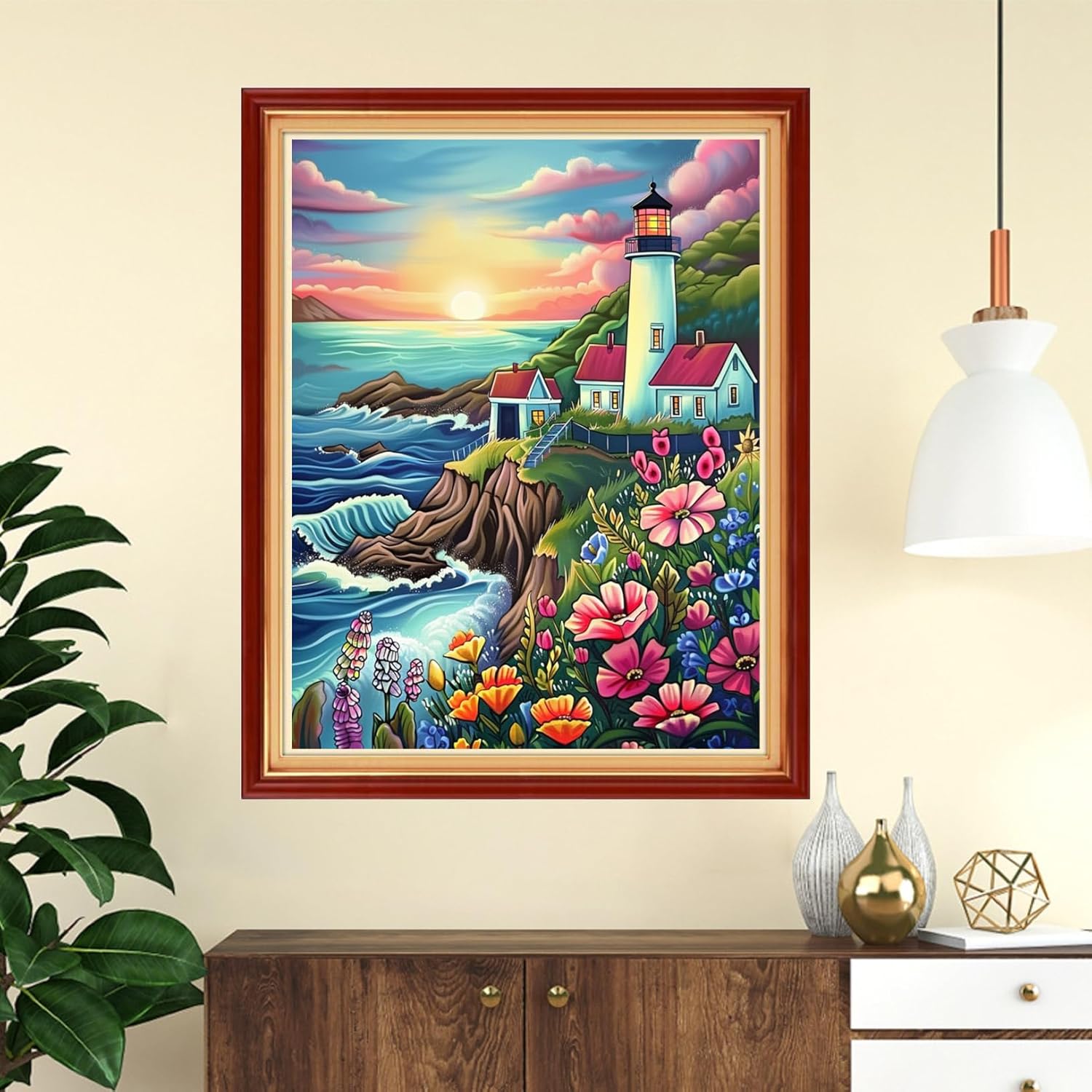 Funchey Stamped Cross Stitch Kits, DIY Cross Stitch Pattern for Adults Beginners Needlepoint Kits Embroidery Kit Arts and Crafts 11CT-Sunrise Seaside Lighthouse 16x20 inchs