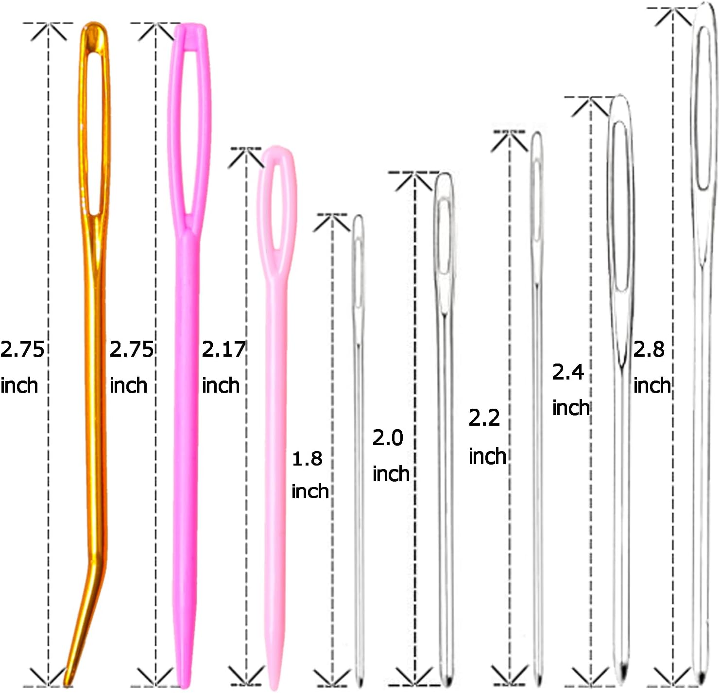 - DIFFERENT SIZES - 2.75in/70mm x 2 (Bent Tapestry Darning Needles), 2.17in/55mm x 1 (plastic needles) ; 2.75in/70mm x 1 (plastic needles) ; 2 inch/52mm x 3 (yarn needles), 2.4 inch/60mm x3(yarn needles), 2.8 inch/70mm x 3(yarn needles), 2.2 inch/56mm x 3(yarn needles), 1.8 inch/46mm x 3(yarn needles). It has different size needles, plastic and metal, and also is a handy kit to have on hand, great variety for beginners and experienced crafters.